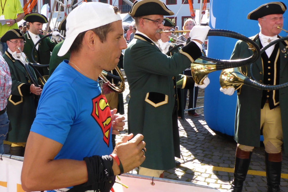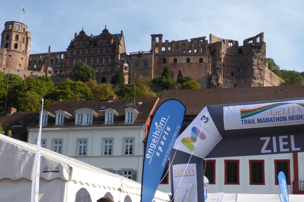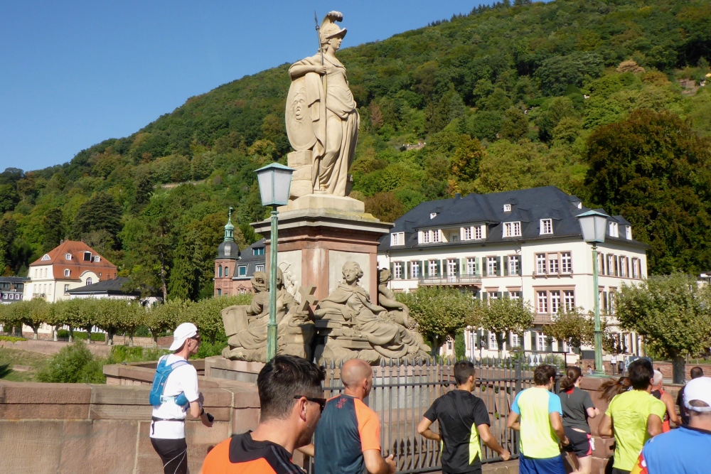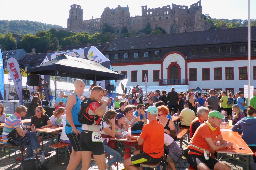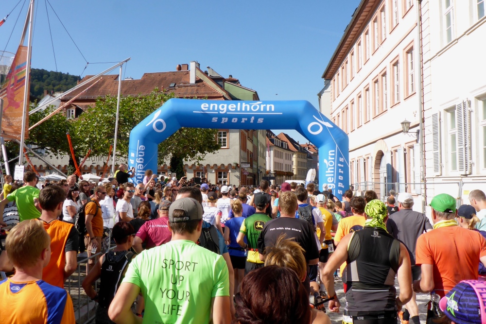 Start und Ziel ist wieder wie im letzten Jahr der Karlsplatz am östlichen Ende der Fußgängerzone, mit schönem Blick hinauf zum Schloss. Vor dem Start erzählt uns ein Moderator noch etwas zum Rennen, stellt einige Promis unter den Läufern vor und weist die Triathleten gleich darauf hin, dass sie den Neckar auf der Brücke überqueren und nicht schwimmen sollen. Dann gibt es noch ein bisschen Blasmusik und wir laufen los.
