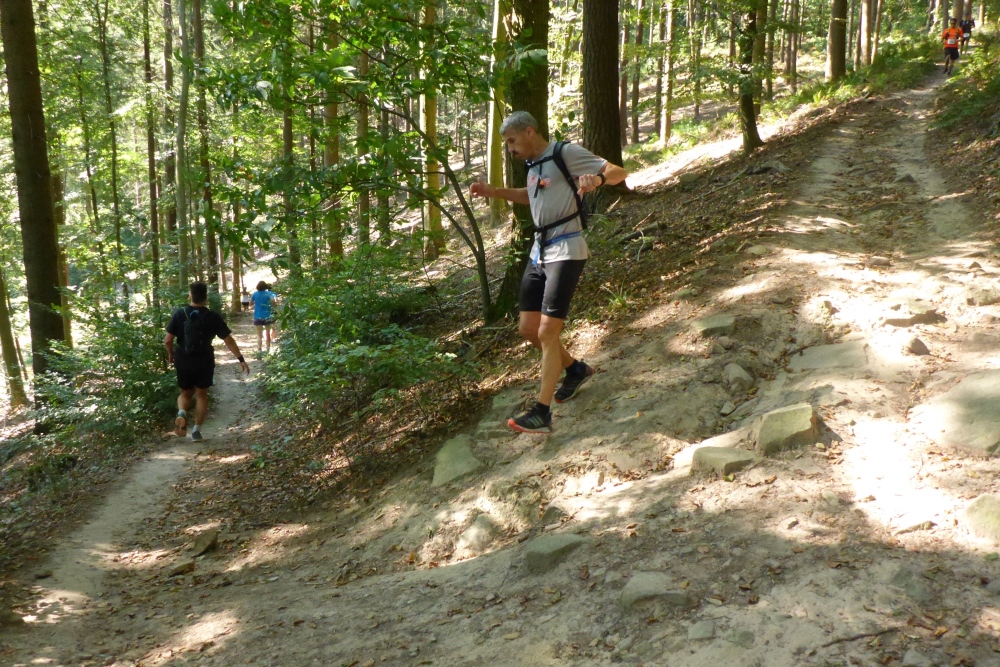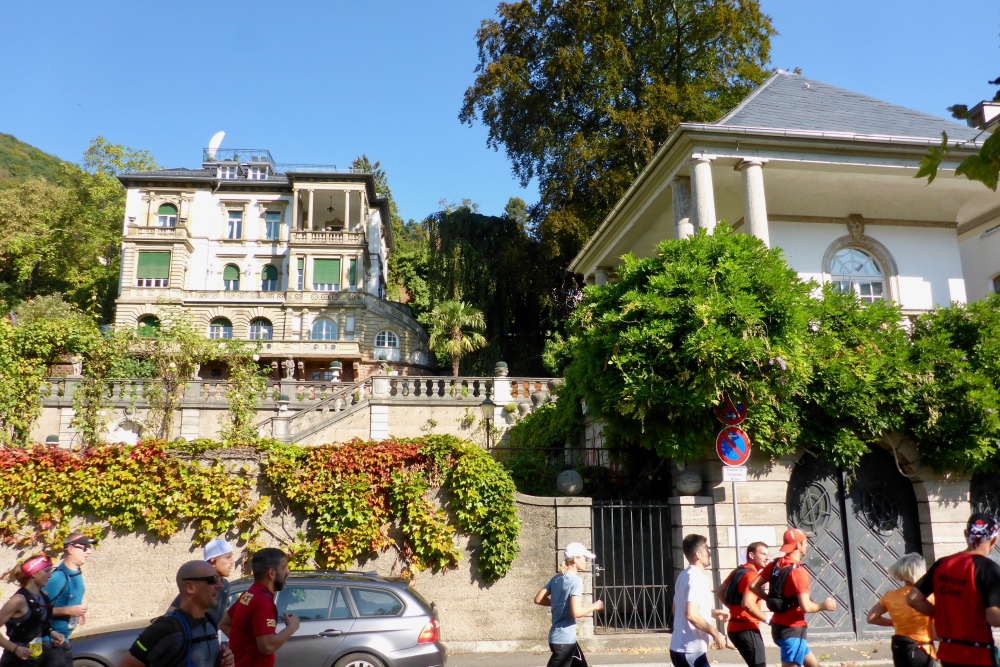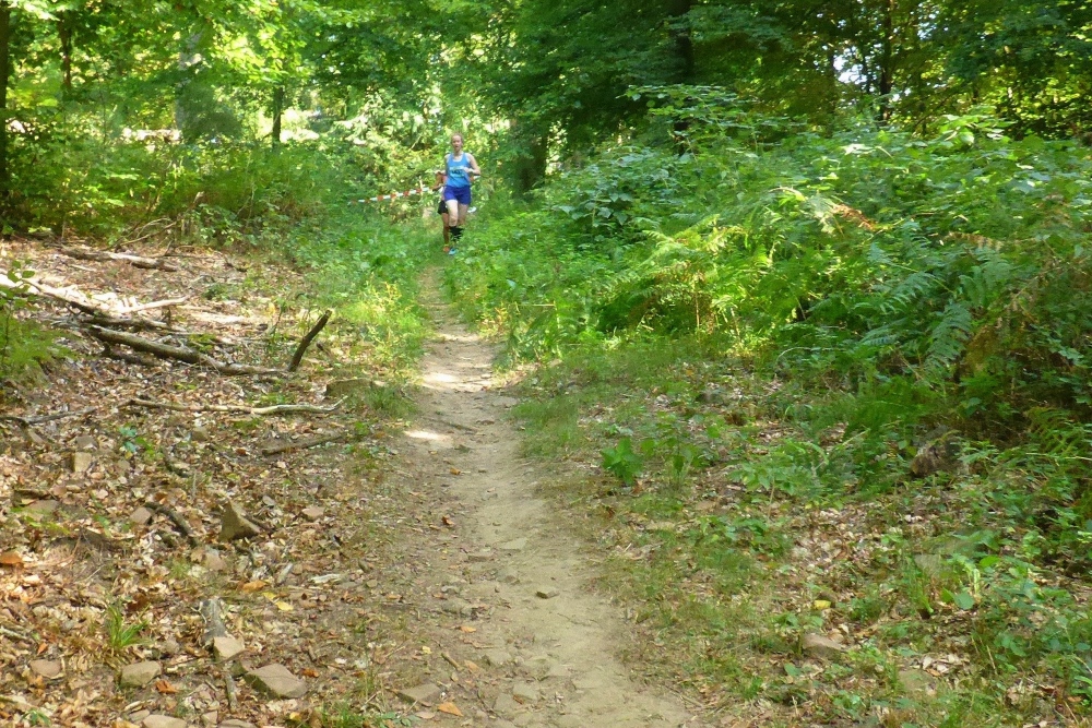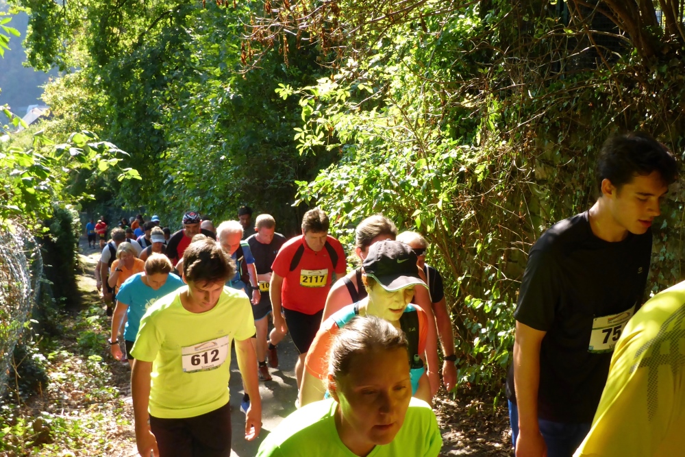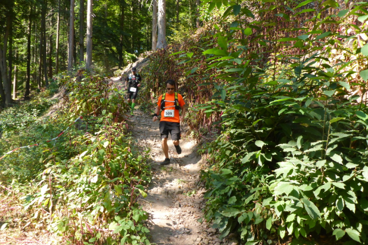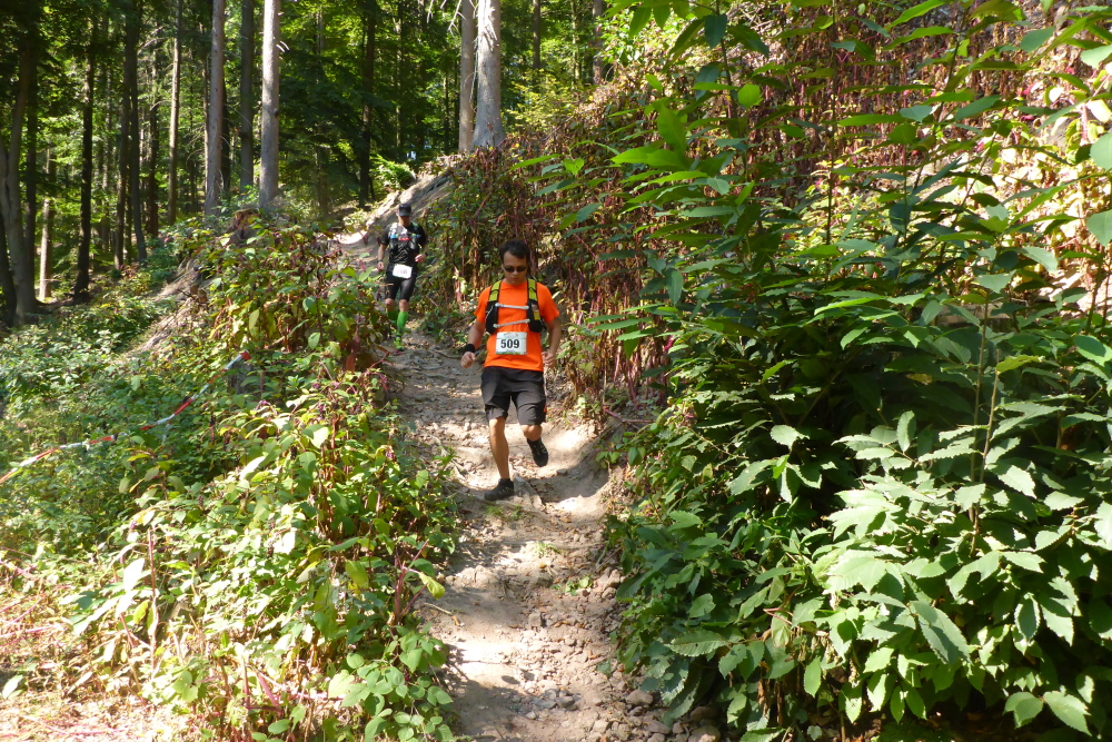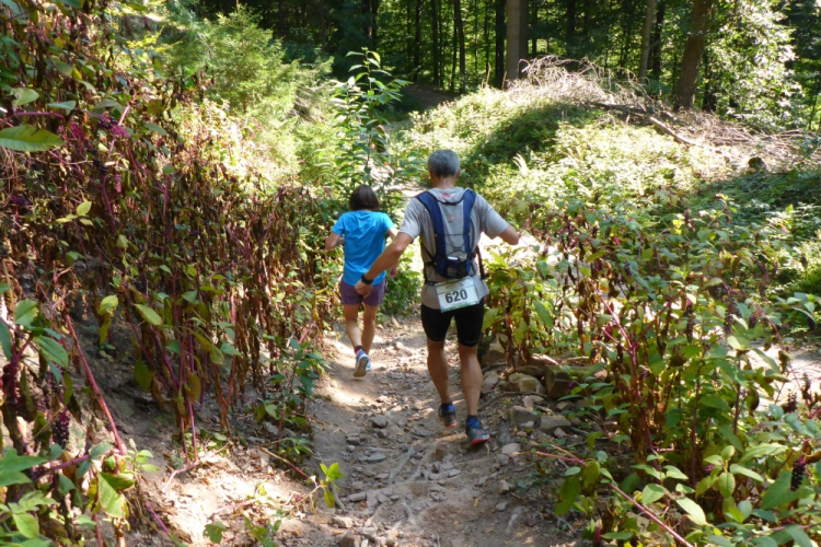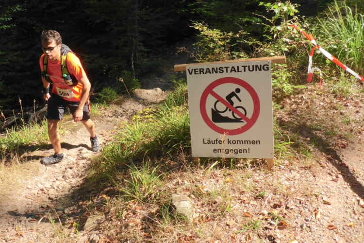 Dann beginnt ein langer Abstieg auf teilweise recht steinigen Trails. Da ich noch mehr als genug Zeit bis zum Zielschluss habe und meine Finisher-Zeit völlig egal ist, renne ich nicht im Kamikazetempo bergab, sondern laufe für meine Verhältnisse eher vorsichtig. Dass der Läufer hinter mir stürzt, hat aber nichts mit der Strecke zu tun. Ein Hund von zwei Spaziergängern, eigentlich mehr Fell als Tier, rennt ihm zwischen die Beine. Ich kommentiere das nicht …