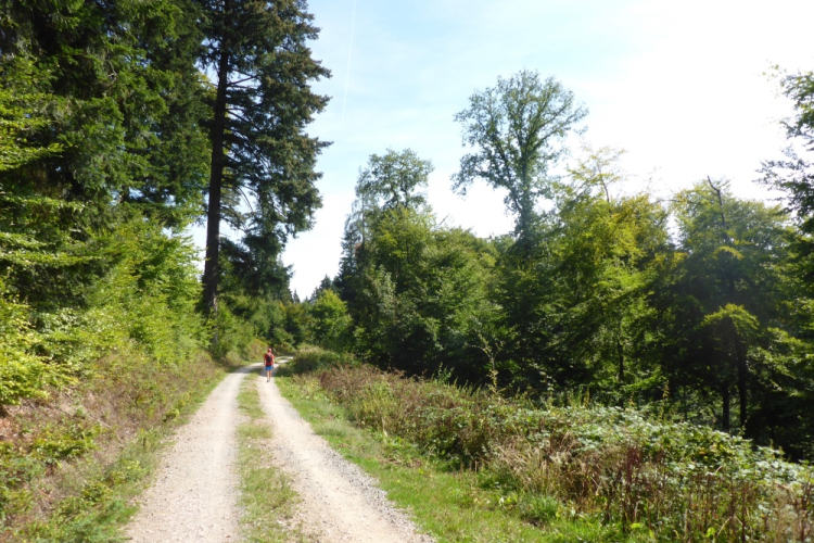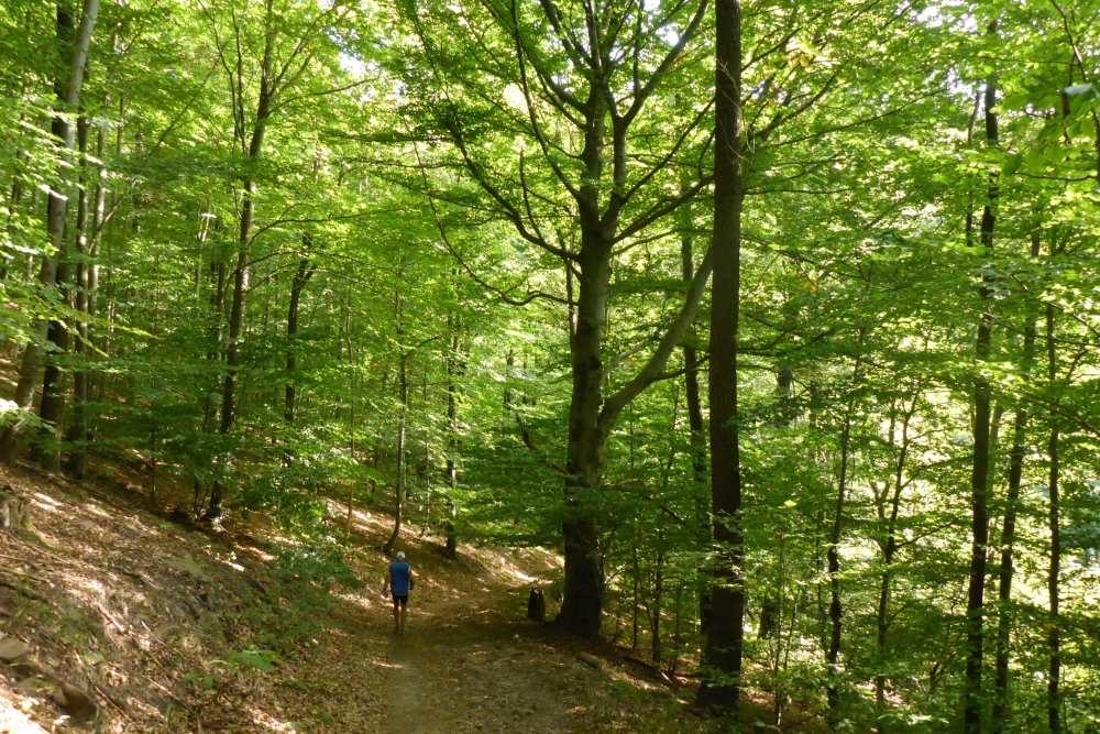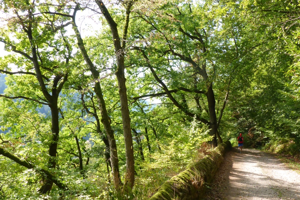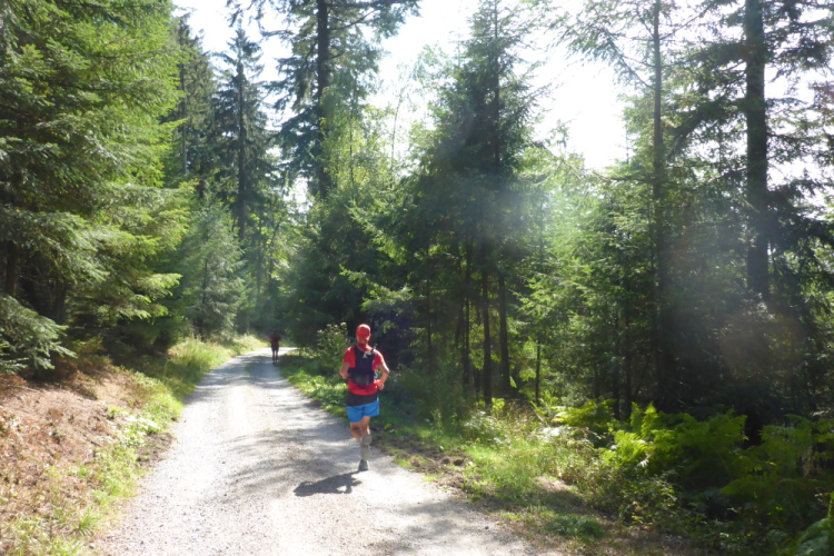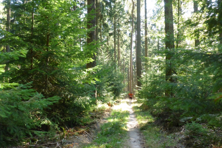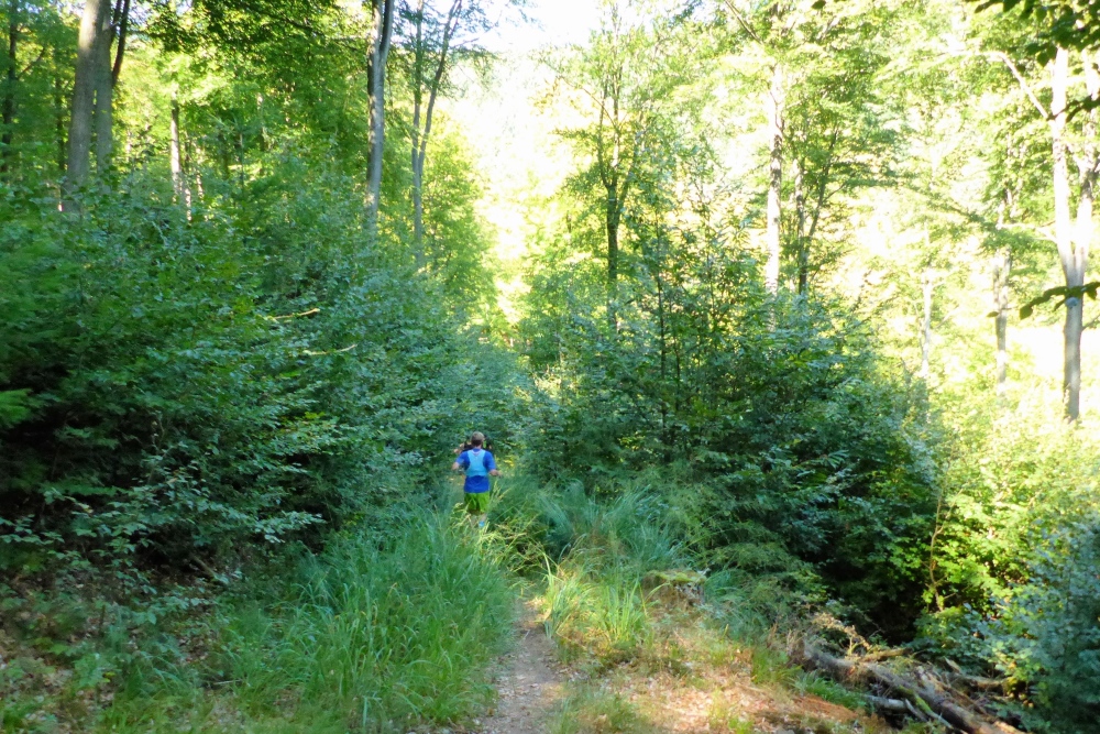 Kurz geht es etwas steil bergauf, dann folgen wieder längere, recht flache Auf- und Abstiege, mal auf breiten Wegen, mal auf leichten Trails. Ich genieße es, nun völlig ohne Zeitdruck laufen oder marschieren zu können.