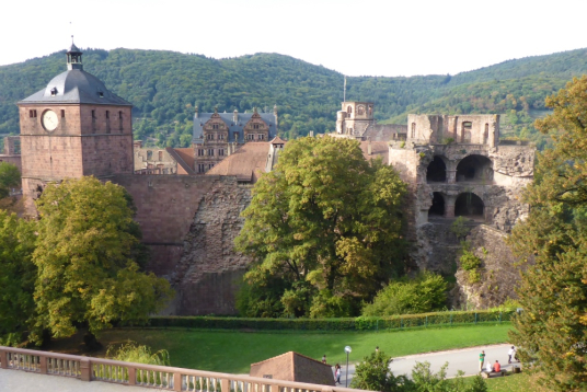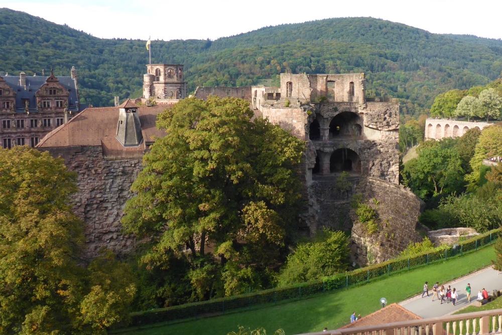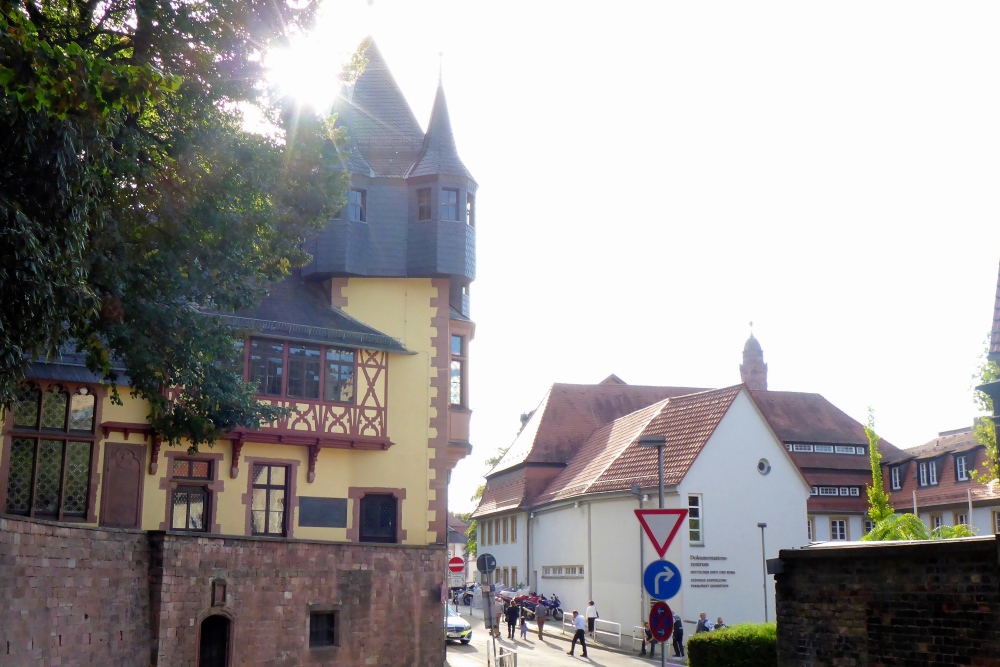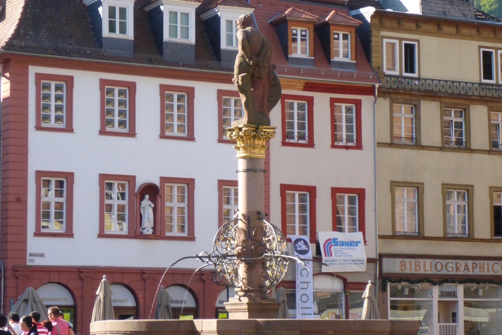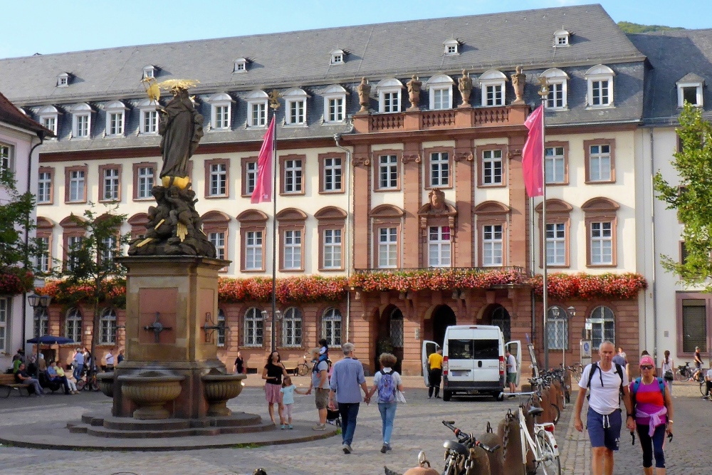 Gleich nach dem Start kommen wir am Rathaus vorbei, sehen die Fassade des barocken Gebäudes aber nur, wenn wir uns umdrehen. Nun geht es über den Marktplatz, in dessen Mitte der Herkulesbrunnen steht. Dieser wurde 1706 bis 1709 errichtet und soll an den Wiederaufbau der im Pfälzischen Erbfolgekrieg schwer zerstörten Stadt erinnern. Blickfang ist hier aber die große Heiliggeistkirche. Das gotische Kirchenschiff aus Sandstein trägt ein barockes Dach. An der Kirche wurde von 1398 bis 1515 gebaut. So lange braucht heute vermutlich nicht einmal mehr der Berliner Flughafen. Der achteckige Turm wird von einer barocken Turmhaube gekrönt. Auffällig sind an der schmucklosen Fassade vor allem die vielen kleinen Läden, die zwischen den Pfeilern Andenken und mehr anbieten. Diese sind keine Erfindung des modernen Tourismus, sondern gab es schon damals. In den Emporen der Kirche stand einst die weltberühmte Bibliotheka Palatina, deren rund 5000 Bücher und 3524 Handschriften im Dreißigjährigen Krieg geraubt wurden. Bis 1936 diente die Kirche 230 Jahre lang zwei Konfessionen. Eine Mauer trennte das protestantische Langhaus vom katholischen Chor.