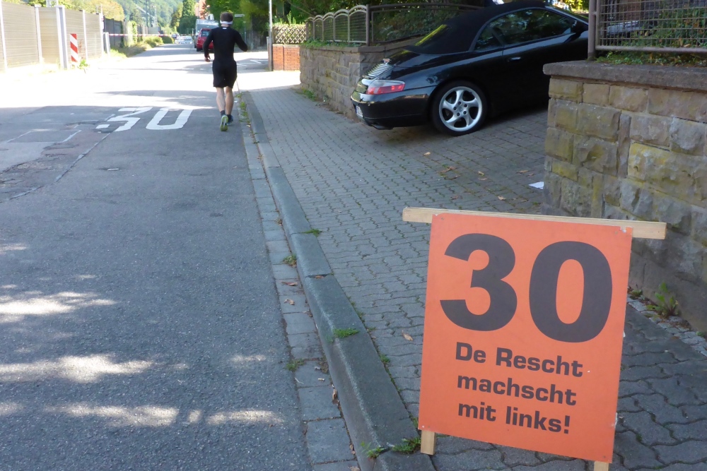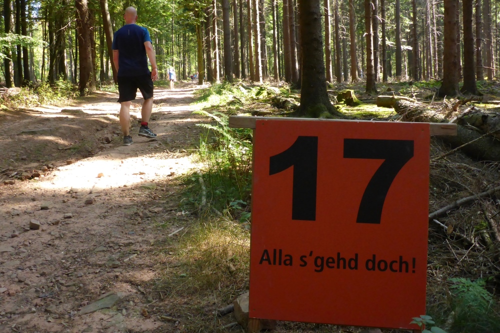 Die im Kurpfälzer Dialekt geschriebenen Sprüche an den Kilometerschildern amüsieren mich. „18 - Volljährisch!“ und mehr originelle Ideen zieren die Strecke.