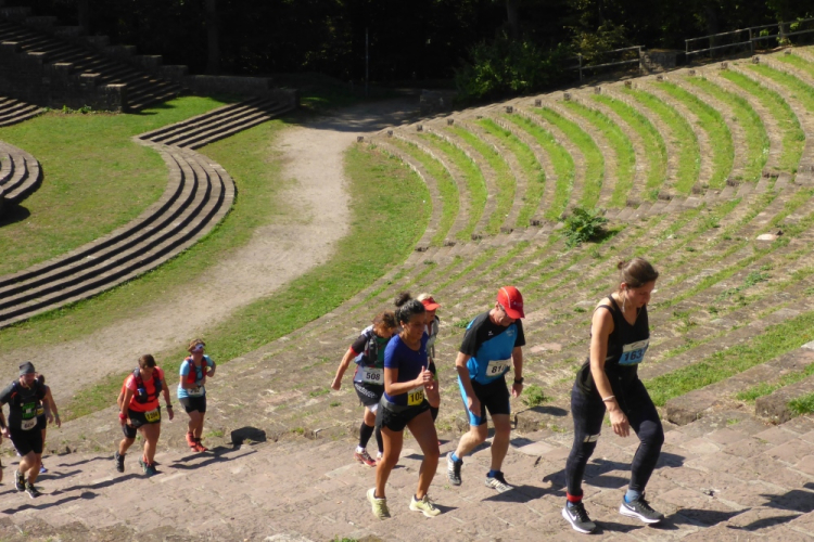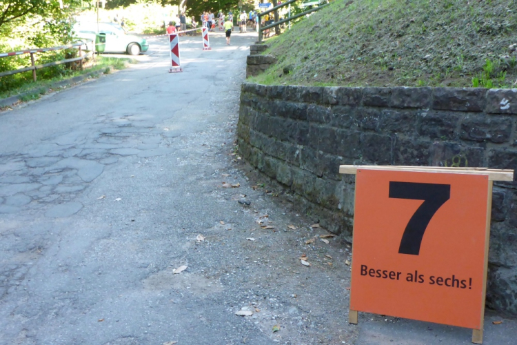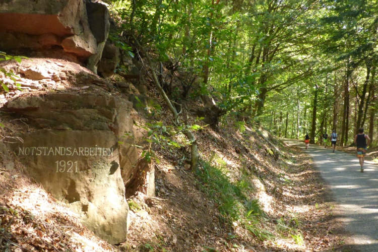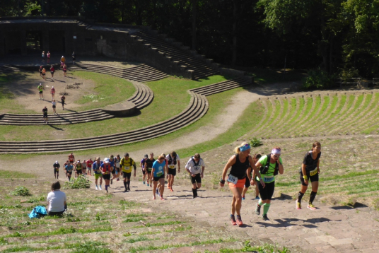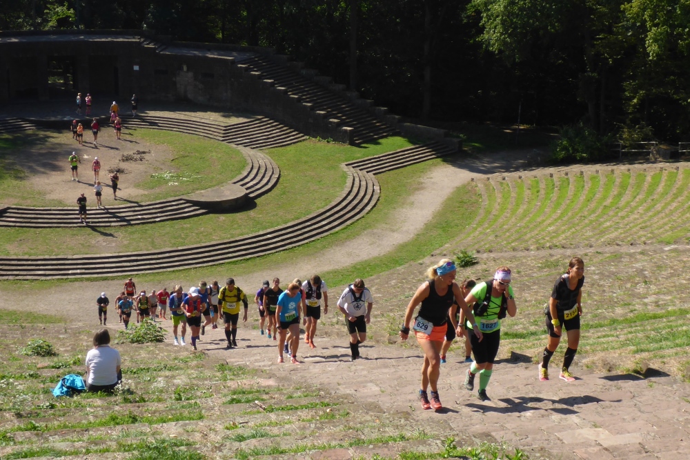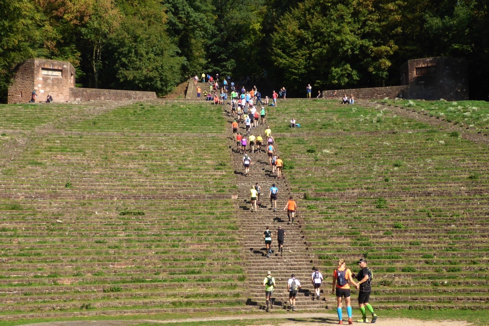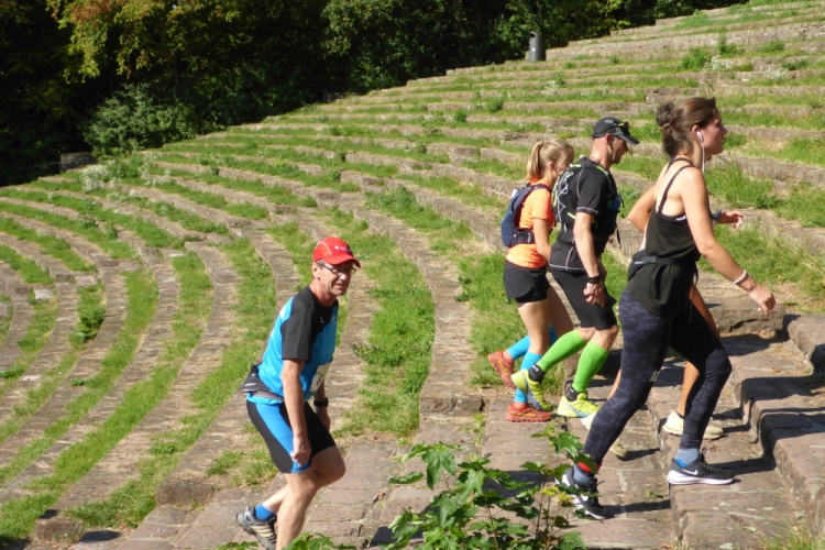 Bald steigen wir 178 Stufen durch die 56 Zuschauerreihen der Thingstätte hoch, eine im Stil griechischer Theater von den Nationalsozialisten errichtete Freilichtbühne. Bei der Eröffnung versammelten sich hier 20.000 Menschen. Da ist mir die heutige Nutzung als Laufstrecke lieber.