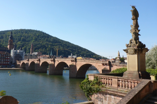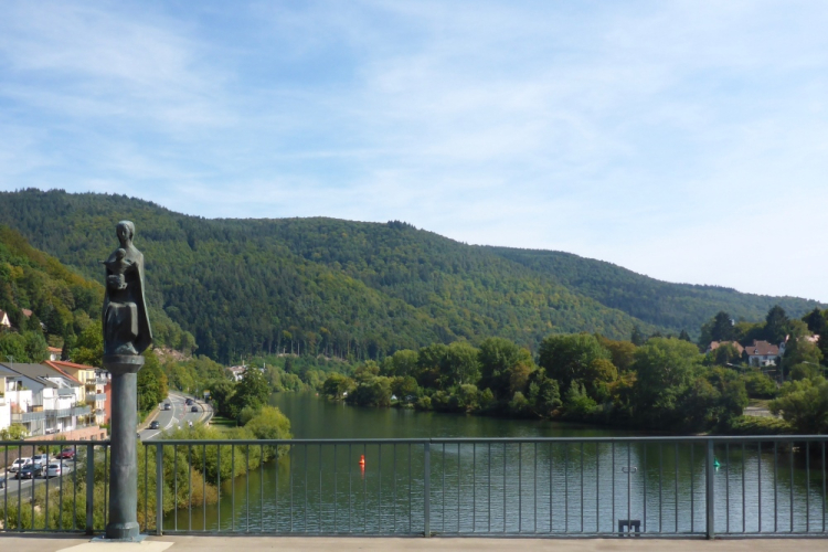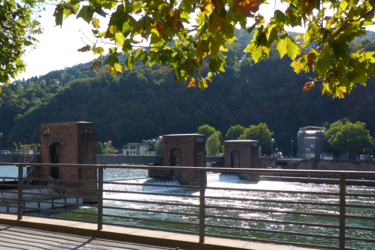 Gleich darauf laufen wir über die 1788 erbaute Alte Brücke, das abgesehen vom Schloss für die internationalen Touristen wichtigste Fotomotiv der Stadt. Das fotogene Brückentor wird momentan aber von einem Baugerüst komplett verhüllt. Auf der Brücke stehen Standbilder des Kurfürsten Karl Theodor und von Minerva, der Göttin der Weisheit.