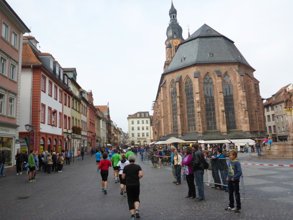 Vorbei an der monumentalen Heiliggeistkirche, zwischen deren Strebepfeilern sich kleine Landenanbauten befinden. Ein Schriftsteller beklagte sich über den sich ausbreitenden Andenkenschund im Schatten des Gotteshauses. Im Inneren sind 54 Gräber der Kurfürsten von der Pfalz und deren Angehörigen.