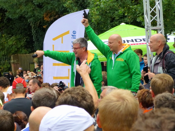 Aus Hunderten Kehlen werden die letzten 10 Sekunden herunter gezählt, dann heißt es „Leinen los“ und der erste Block spurtet davon. Nur eine Straßenkurve weiter kann man sich bereits davon überzeugen, warum die Blockbildung Sinn macht. Denn schon stürzt sich die Meute einen geschotterten Zickzacksteig, schmal und steil, gen Schlosspark hinab. Bei größerem Andrang müsste man wohl befürchten, dass sich der motivierte Läuferpulk bereits hier wie Lemminge ins Verderben stürzt.