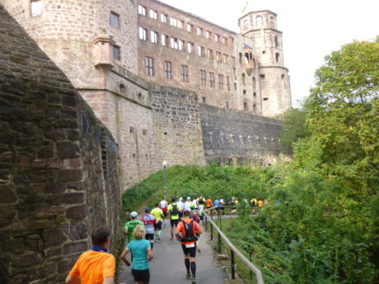 Bereits bei der Wahl der Location für Start, Ziel und das ganze Drumherum zeigen die Organisatoren Sinn für Stil und Ambiente. Im letzten Jahr war der Universitätsplatz noch Nabel des Laufspektakels. Heuer ist man „aufgestiegen“, gen Heidelberger Schloss. Hoch thront die einstige Residenz der pfälzischen Kurfürsten über Stadt und Neckartal. Bereits in den Erbfolgekriegen im 17. Jh. wurde das Schloss durch die Franzosen zerstört. Fast schon ein Glücksgriff war, dass es in der Folgezeit nur teilweise wiederhergestellt, in diesem Zustand aber bis heute aufwändig restauriert und konserviert wurde. Erst dadurch hat sie ihren Aufschwung zur weltweit gerühmten Insignie einer romantischen Ruine genommen. Spürbar ist die Magie dieses Ortes vor allem, wenn man erleben darf, wie der rote Neckarsandstein der Gemäuer in der Abendsonne erstrahlt.