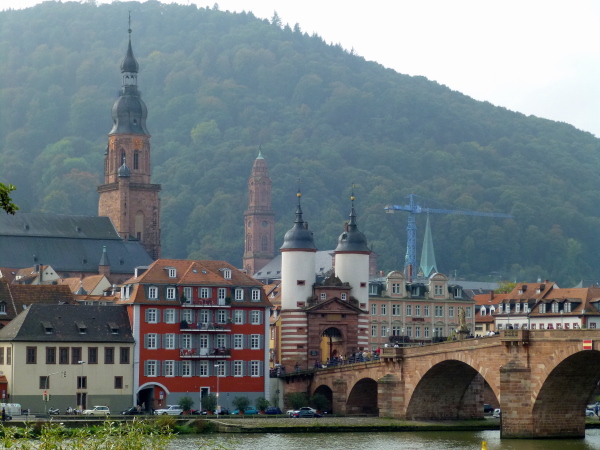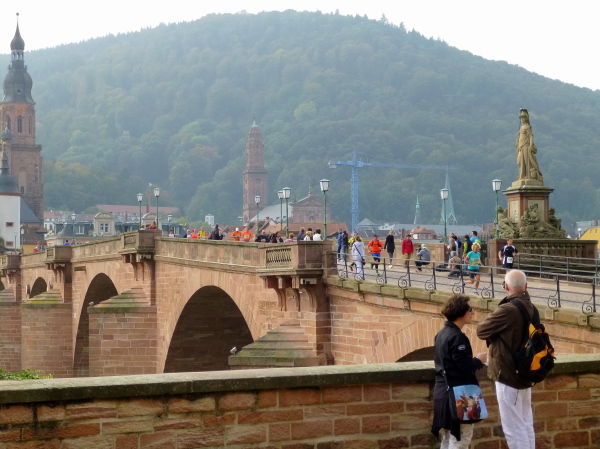 Die ersten drei Kilometer liegen hinter uns, als wir über diese Brücke den Altstadtkern verlassen und den Neckar queren. Es lohnt sich hier, den Blick zu wenden. Denn die Postkarten-Panoramakulisse der Altstadt, überragt von Kirchtürmen und Schloss vor den laubbewaldeten Hängen des Königstuhls, ist ohne Zweifel eines der optischen Highlights des Streckenkurses.