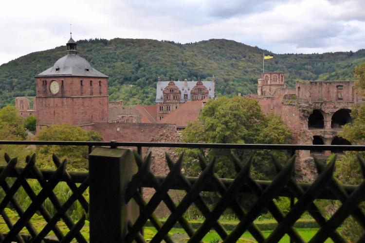 Ein schmaler Pfad zweigt ab, wieder bergab und besser zu laufen. Nun kann ich es noch einmal rollen lassen. In Serpentinen geht es nach unten bis zur Straße. Bevor ich die Fahrbahn erreiche, leiten mich Pfeile auf einen schmalen Weg oberhalb der Straße entlang. Eine kleine Treppe bringt mich auf einen Parkplatz, wo eine Helferin mir den weiteren Streckenverlauf erklärt: noch eine letzte kleine Steigung, dann links. Es geht erneut auf einen Trail. Vor mir liegt eine Brücke, die über die Gleise der Standseilbahn führt. Unter mir kann ich die Heiliggeistkirche, das Brückenhaus und die Alte Brücke erkennen. Über mir liegt die Station „Molkenkur“ der Bahn.