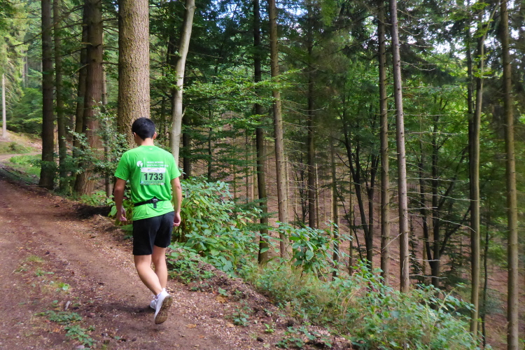 Nach ein paar weiteren Kilometern trennt sich die Strecke von Marathon und Half-Trail, der auch 30 km und 1000 Hm hat. Eine Zeitmessung mitten im Wald stellt sicher, dass auch jeder, der Marathon läuft, hier erfasst wird. Wir sind abwechselnd auf breiteren Wegen und schmalen Trails unterwegs. Plötzlich beginnt es zu regnen. War es mir bisher einen Tick zu warm, ändert sich das schlagartig. Als ich gerade überlege, meine Regenjacke aus dem Rucksack zu holen, hört es bereits wieder auf.