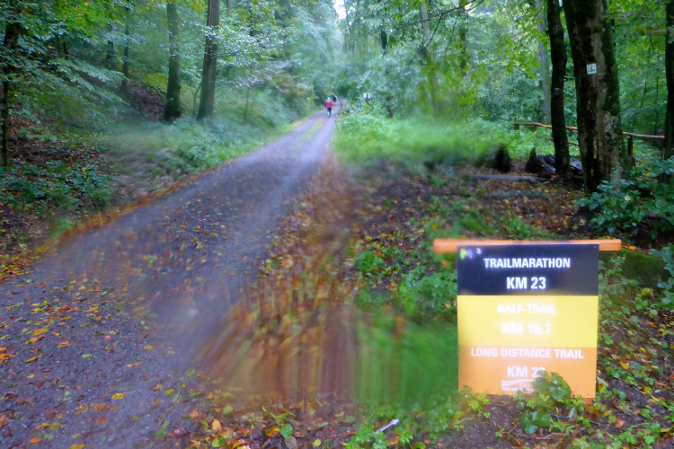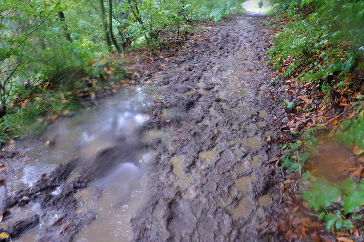 Ein längerer kontinuierlicher Abschnitt bergab auf einem Schotterweg bringt mich etwas auf Temperatur. Nach 22 km werden wir wieder querfeldein geleitet, auch die Pfade haben es mittlerweile gehörig in sich. Ich bin jetzt gut 3 Stunden unterwegs und genauso lange dauert auch schon die Dauerdusche. Die Trails sind praktisch „Land unter“. Nur äußert vorsichtig sind steilere Abschnitte zu passieren, sonst nimmt man schneller ein Schlammbad als einem lieb ist. Trailschuhe mit gutem Profil sind natürlich von großem Vorteil. Obwohl völlig durchnässt, versuche ich immer wieder den tiefen Schlamm- und Wasserlöchern auszuweichen. Warum eigentlich?