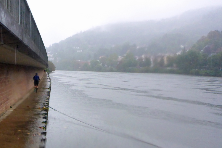 Wir laufen Richtung Marktplatz an der Heilig-Geist-Kirche vorbei. Trotz Schmuddelwetter haben sich viele Zuschauer eingefunden und feuern uns an. Nach rechts geht es runter zur Alten Brücke, die wir bereits nach 300 Metern erreichen und überqueren. Auch hier ist einiges los. Ich denke nicht, dass es Touristen sind, dafür sind sie zu interessiert. Tolle Fotomotive gibt es auch. Brücke, Brückenfiguren, Rundtürme, Schloss und der Fluss, dazu die bunte Läuferschar. Wunderbar. Nach Überquerung laufen wir noch flach 500 Meter am Neckar entlang, dann wird’s ernst.