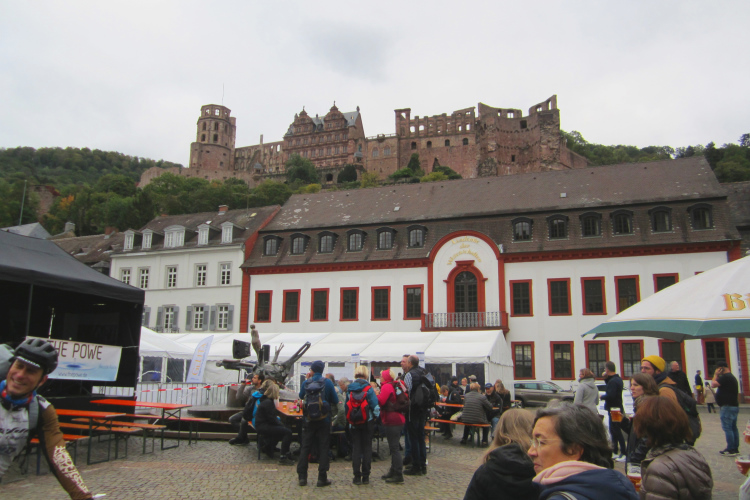 Am Heidelberg Schloss beginn für uns sozusagen der Endspurt. Die beiden finalen Schlusskilometer liegen noch vor uns. Auf unterschiedlich hohen Terrassen schlängeln wir uns durch den romantischen Schlossgarten, dem einst berühmten Hortus Palatinus. „Vater Rhein“ lässt schön grüßen aus seinem Brunnen. Bis zu seiner Zerstörung im Pfälzischen Erbfolgekrieg war das Schloss die Residenz der Kurfürsten von der Pfalz. Nach mehreren Zerstörungen im 17 Jahrhundert wurde es teilweise restauriert. Nach Blitzeinschlägen 1764 mit mehreren Bränden wurde die Wiederherstellung aufgegeben.