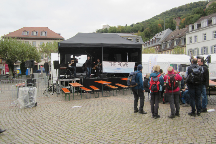 In der Altstadt, direkt unterhalb des Heidelberger Schlosses liegt der Karlsplatz. Hier befindet sich das Start- und Zielgelände mit Festzelt, wo wir auch unsere Startunterlagen empfangen können. Am Samstagnachmittag ist hier nicht sonderlich viel los. Wartezeiten gibt’s da keine. Im Open Air Bereich ist eine Bühne aufgebaut, eine Band gibt gerade ihr Bestes. An einem Stand kann man sich von 15 bis 20 Uhr eine Portion Maultaschen einverleiben, der Gutschein dafür wurde mit der Startnummer ausgehändigt.
