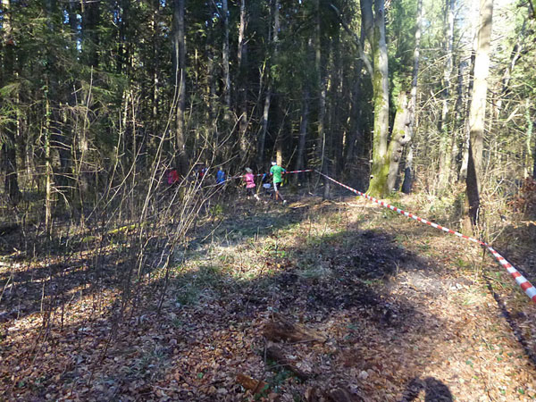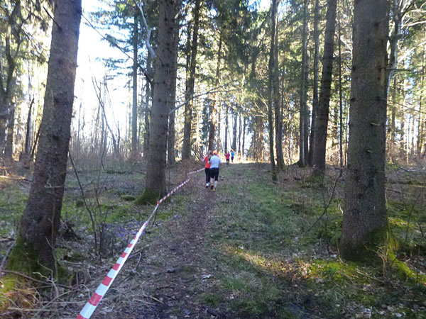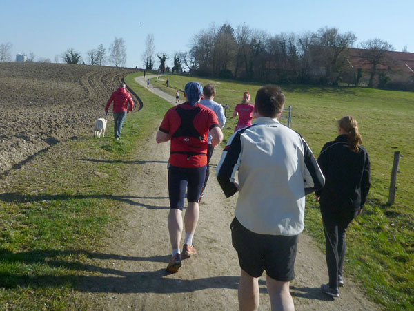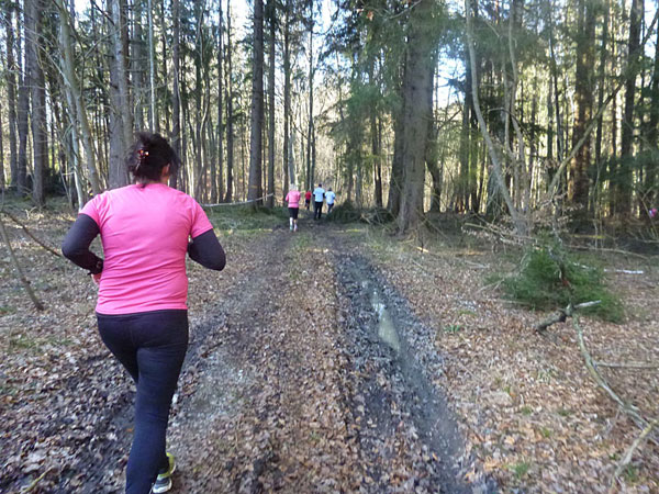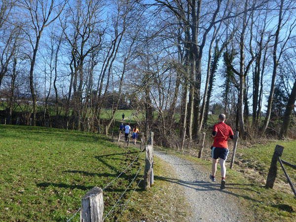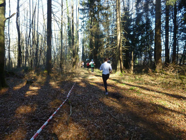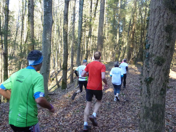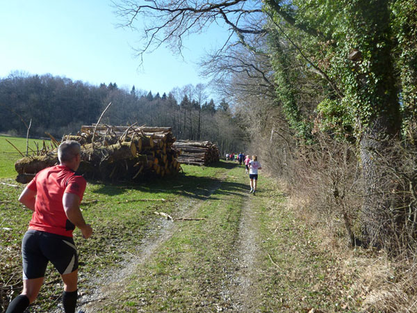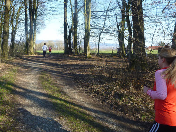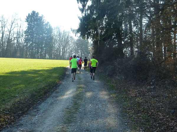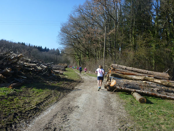 Über einen Kilometer führt ein Wirtschaftsweg ausschließlich bergauf am Waldrand entlang zum höchsten Punkt der Strecke. Rechts von uns befindet sich im Wald der Albangraben. Ich spähe etwas sehnsüchtig hinunter, hier gäbe es sicher auch einige interessante Trails zu finden. 50 Höhenmeter beinhaltet das Bergaufstück, nicht sonderlich steil und daher auch gut zu laufen, aber nicht zu unterschätzen, da es sich kontinuierlich und gleichmäßig nach oben zieht. Wer hier etwas anziehen kann, dem wird eine ordentliche Bergsession geboten.