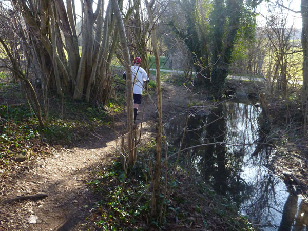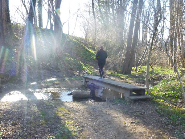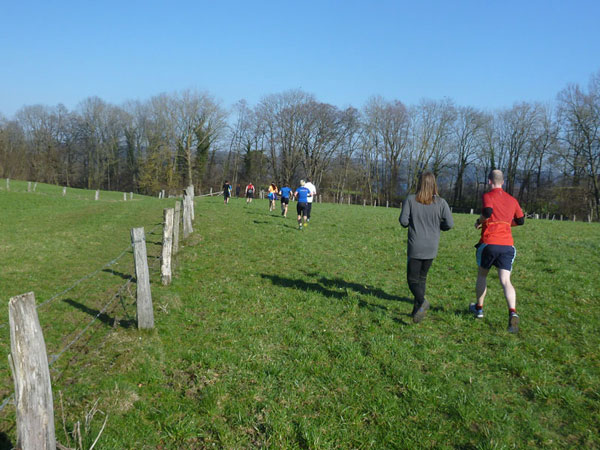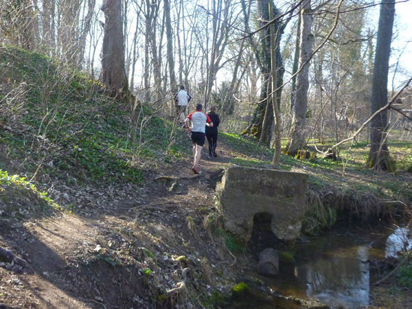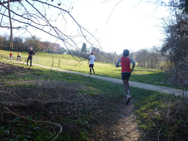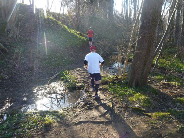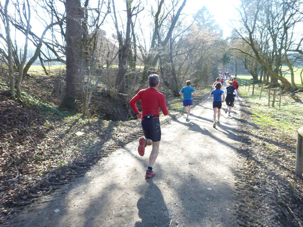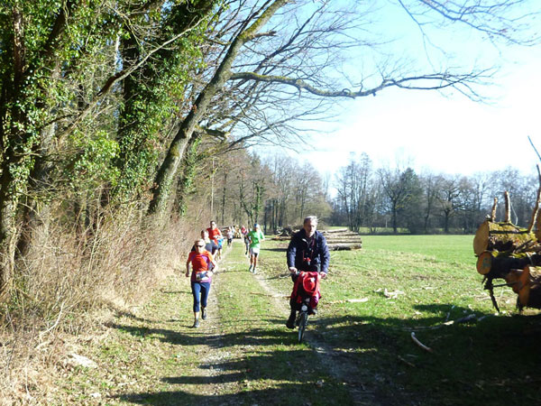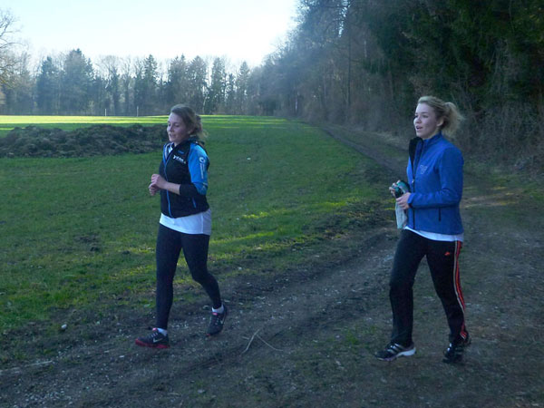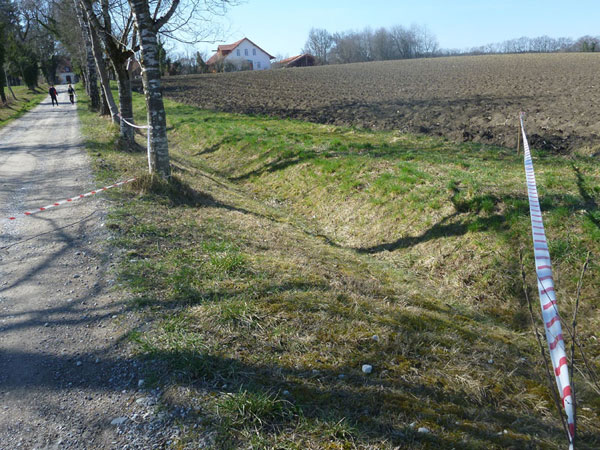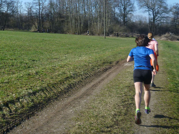 Über einen Kilometer führt ein Wirtschaftsweg ausschließlich bergauf am Waldrand entlang zum höchsten Punkt der Strecke. Rechts von uns befindet sich im Wald der Albangraben. Ich spähe etwas sehnsüchtig hinunter, hier gäbe es sicher auch einige interessante Trails zu finden. 50 Höhenmeter beinhaltet das Bergaufstück, nicht sonderlich steil und daher auch gut zu laufen, aber nicht zu unterschätzen, da es sich kontinuierlich und gleichmäßig nach oben zieht. Wer hier etwas anziehen kann, dem wird eine ordentliche Bergsession geboten.