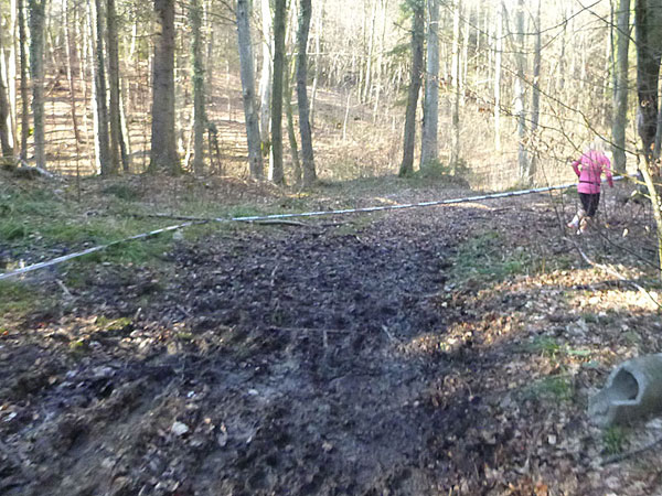 Nach gut zwei Kilometern ist man oben und es geht endlich rein in den Wald und auf einen herrlichen Single Trail. Der hat neben Wurzeln und Blättern auch einige anspruchsvolle matschige Abschnitte zu bieten, bei denen gutes Profil gefragt ist. Nach 500 Metern ist der Spaß auch schon wieder vorbei und wir verlassen das Waldstück.