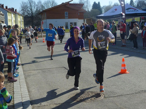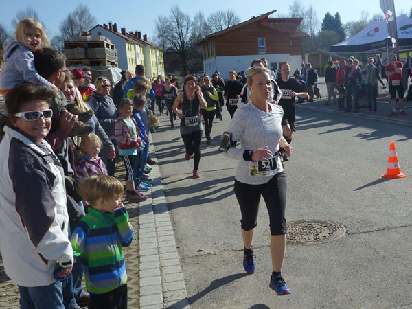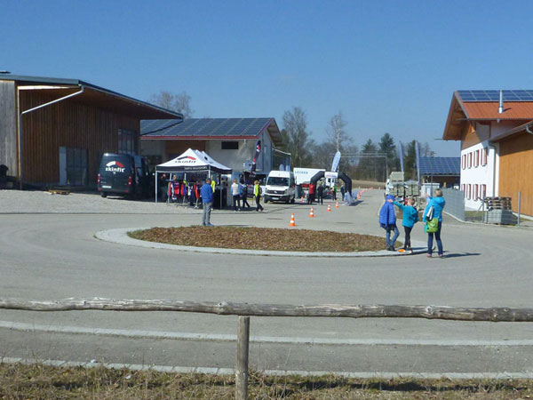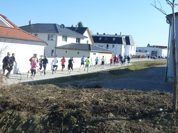 Nur ein paar Meter sind es bis zu einem Kreisverkehr, den wir umrunden, um anschließend wieder zurück durch’s Ziel zu laufen. So dürfen uns die Zuschauer noch ein zweites Mal bejubeln. Nach ein paar Gefällmetern passieren wir das Fitnessstudio und wenig später verlassen wir auch schon diesen ersten 400 Meter langen Asphalt-Abschnitt. Das war’s dann auch schon mit befestigten Wegen.
