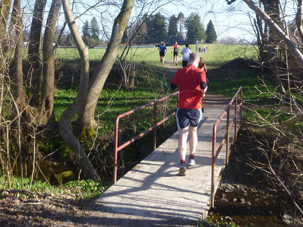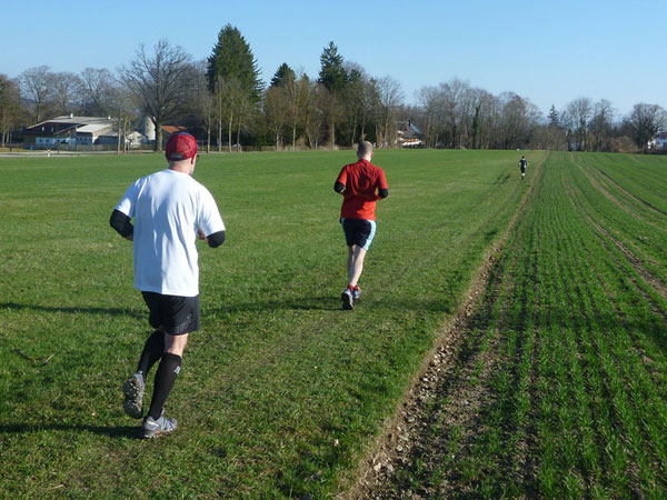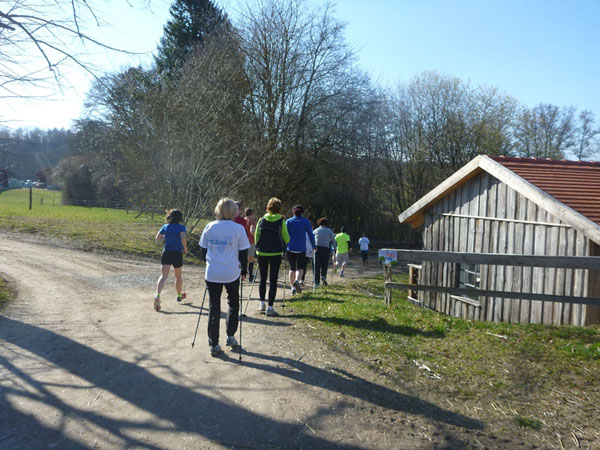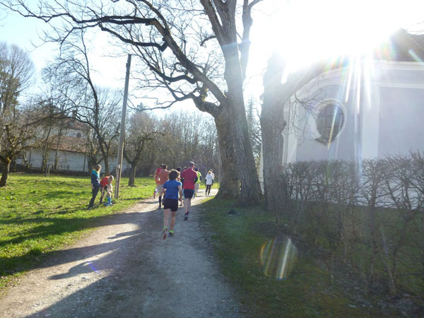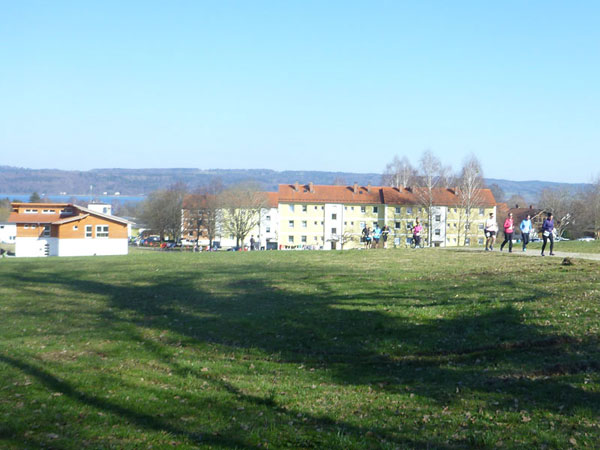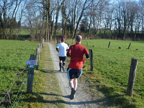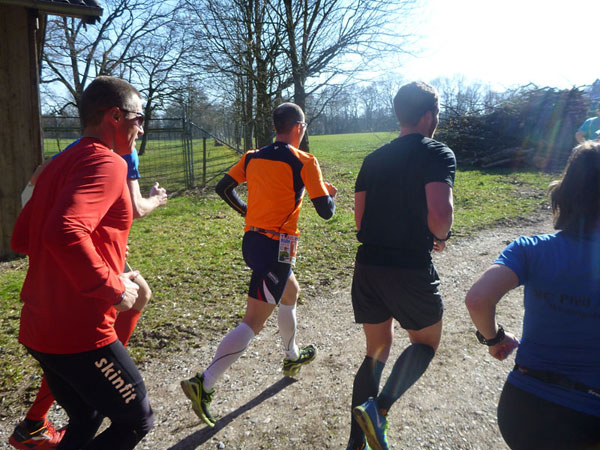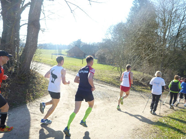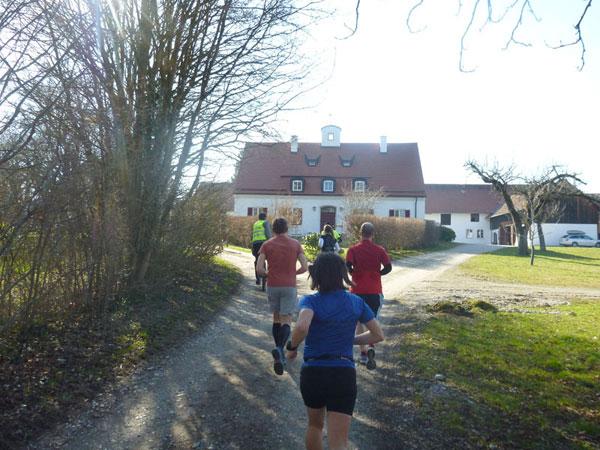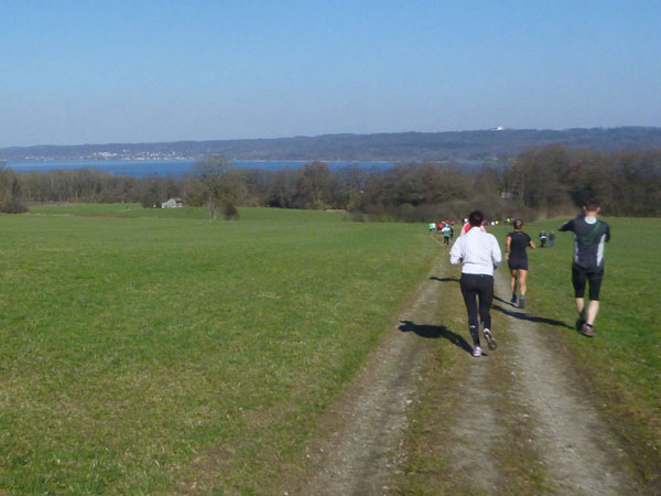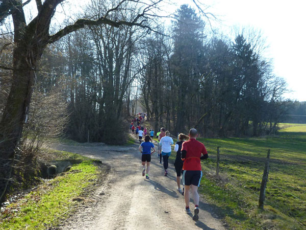 Alle gewonnenen Höhenmeter dürfen wir auf den nachfolgenden zwei Kilometern wieder abgeben. Abwechslungsreich geht es über schmale Wege und Pfade, Wiesen und Felder hinunter nach Bierdorf zum nördlichsten Punkt der Strecke. Ab hier folgen wir dem Ammersee Höhenweg wieder zurück Richtung Dießen. Kurz vor Gut Romenthal führt uns ein kurzer Abschnitt durch ein Wäldchen auf einen weiteren Single Trail entlang des Alban Grabens, wo uns noch ein kurzer knackiger Anstieg erwartet. Nach links geht es wieder auf dem Ammersee-Höhenweg bis Gut Romenthal und anschließend neben der Straße an einem Feld entlang Richtung Start und Ziel wo auch die einzige Versorgungsstation der Strecke eingerichtet ist. Die ersten 5,7 km sind durch.