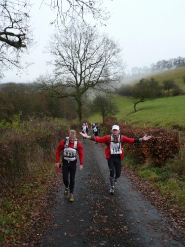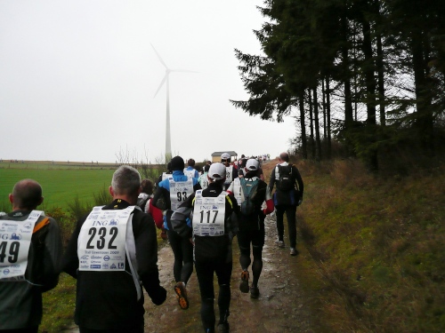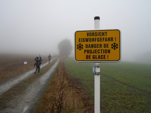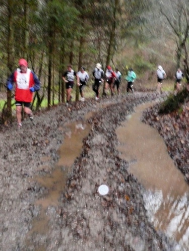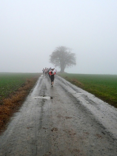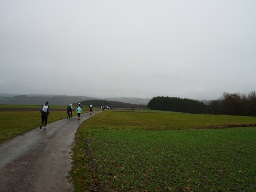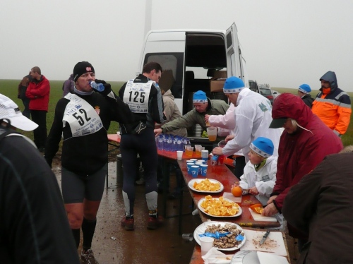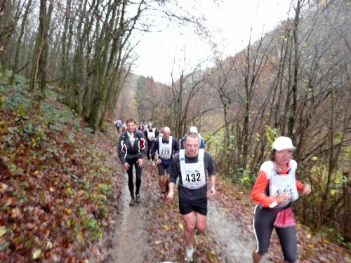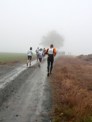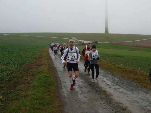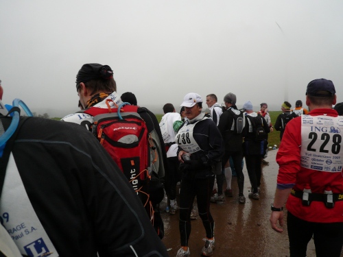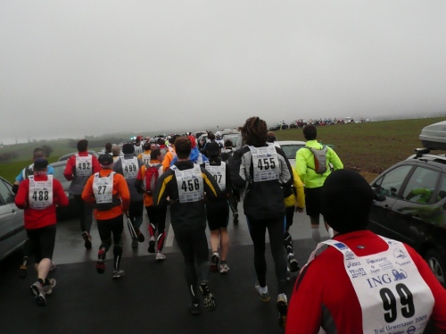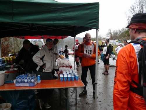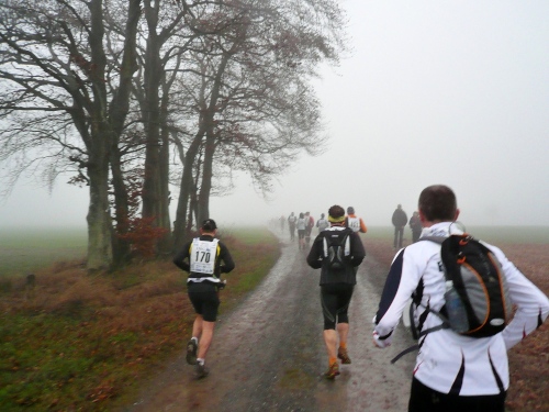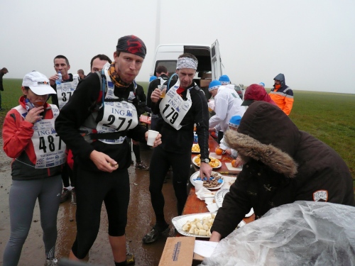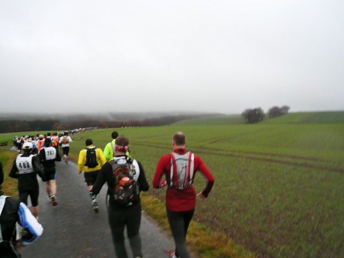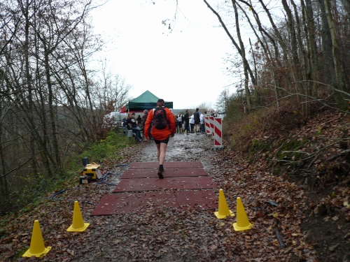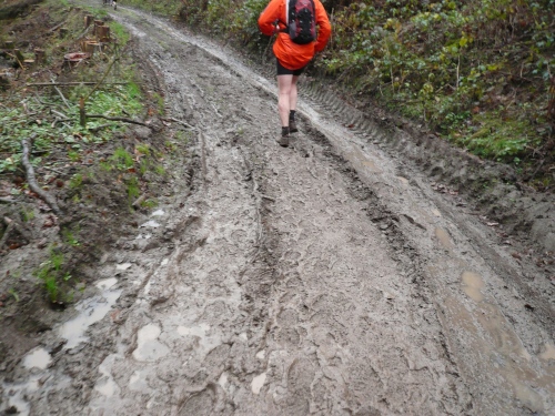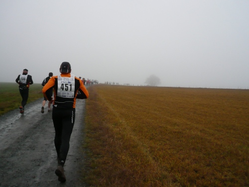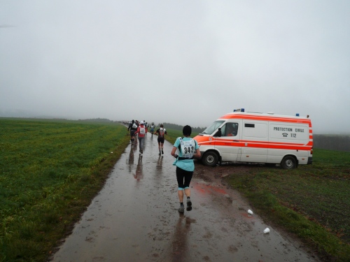 Im Startzelt ist kein Platz, aber man hat Zeit. Viele stehen noch in der Halle oder im Verpflegungszelt, als wir loslaufen. Hinter dem Ort geht die Matschpartie los: Steil abwärts, ich lasse mich mitreissen, Äste peitschen mit entgegen, mein Knie blutet. Nach zwei Kilometern sind die Füße nass. Steil geht es wieder bergauf . Vor der ersten Verpflegungsstation ein ebener Weg, es wird der letzte sein für heute.
