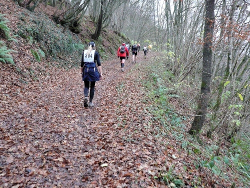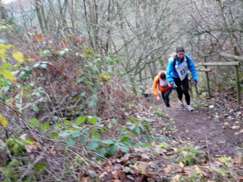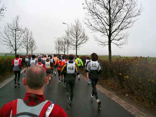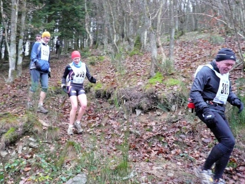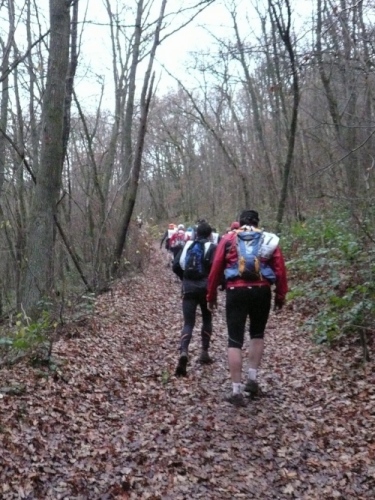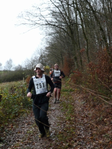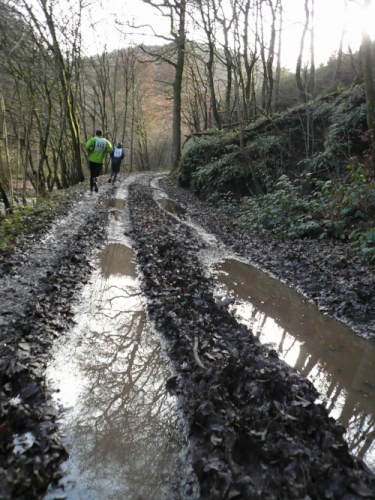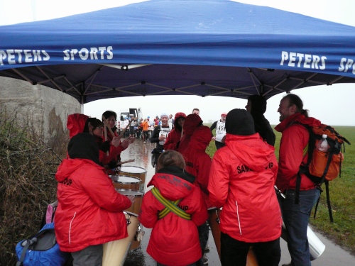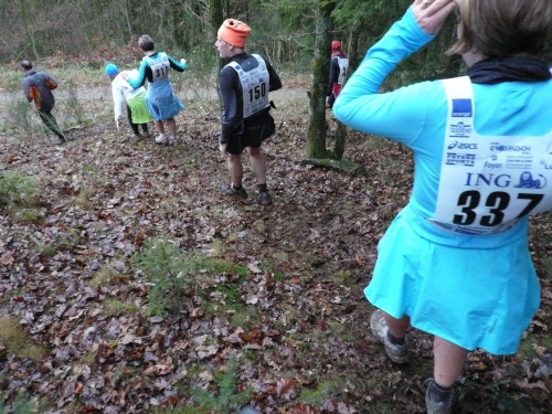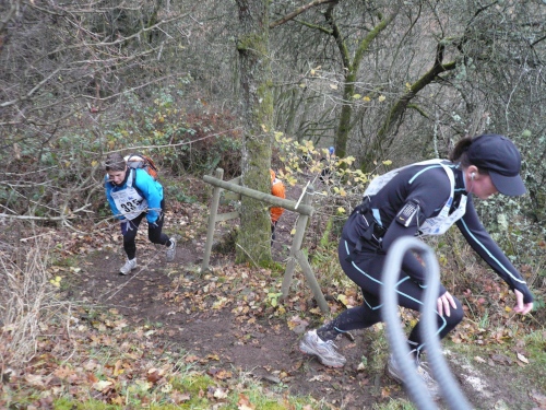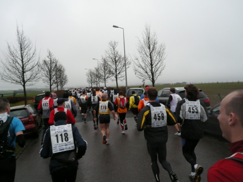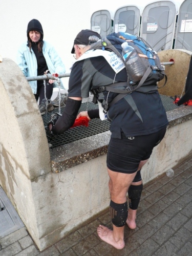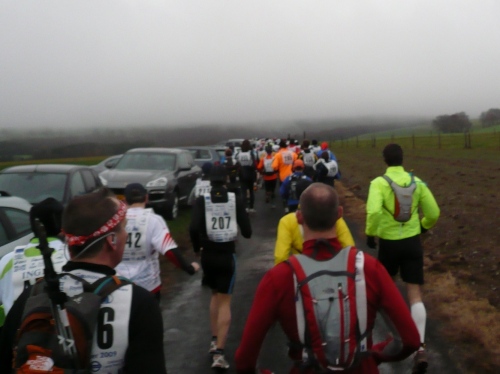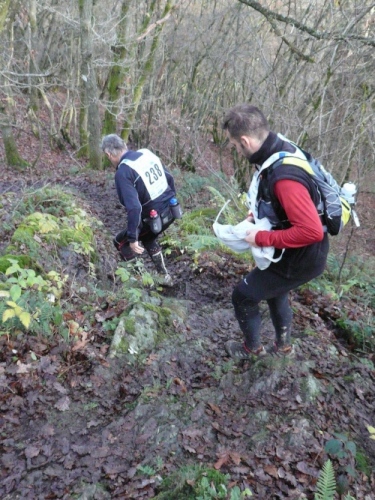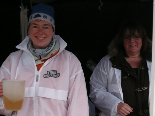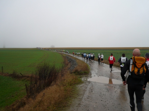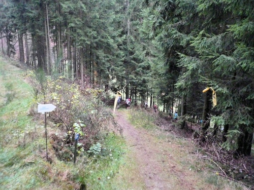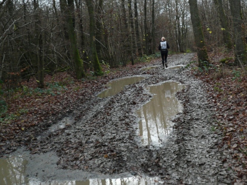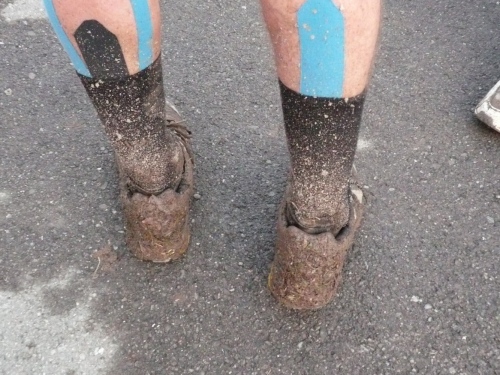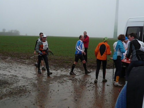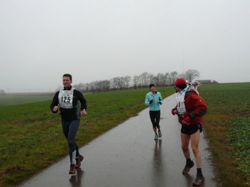 Im Startzelt ist kein Platz, aber man hat Zeit. Viele stehen noch in der Halle oder im Verpflegungszelt, als wir loslaufen. Hinter dem Ort geht die Matschpartie los: Steil abwärts, ich lasse mich mitreissen, Äste peitschen mit entgegen, mein Knie blutet. Nach zwei Kilometern sind die Füße nass. Steil geht es wieder bergauf . Vor der ersten Verpflegungsstation ein ebener Weg, es wird der letzte sein für heute.
