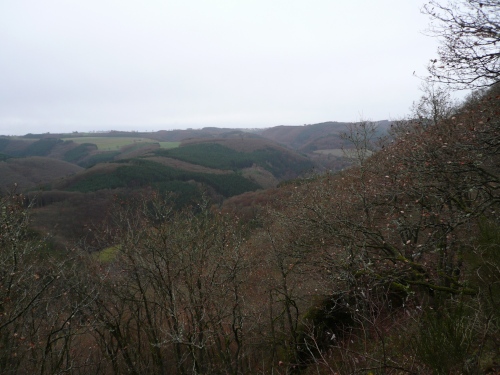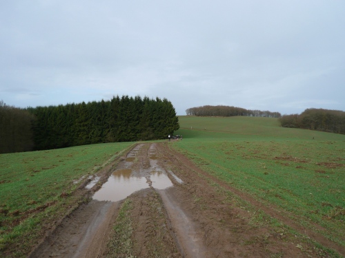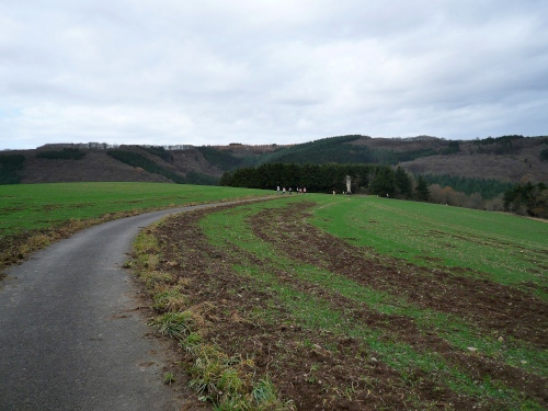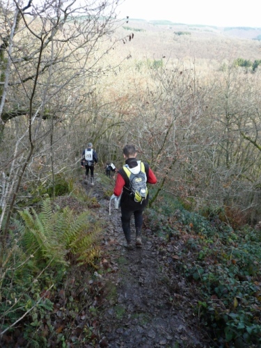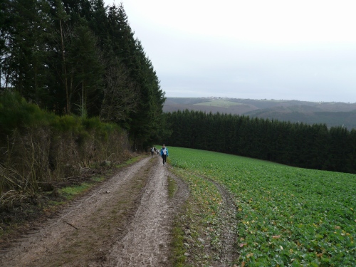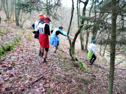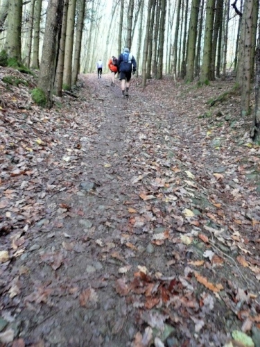 Durch die mickrigen Bäume hat man einen Blick weit über die Grenzen des Großherzogtums bis in die belgischen Ardennen und hinüber zur Eifel. Schroffe Ginster und Farnlandschaft, dazwischen glänzende Schieferplatten. Unter uns liegt Heischtergronn (Heiderscheidgrund), das im 18. Jahrhundert wegen seiner hungernden Bevölkerung „Ort der Bettler“ genannt wurde. Hier ist unser dringend benötigter zweiter VP , betteln nicht nötig, es gibt genug.