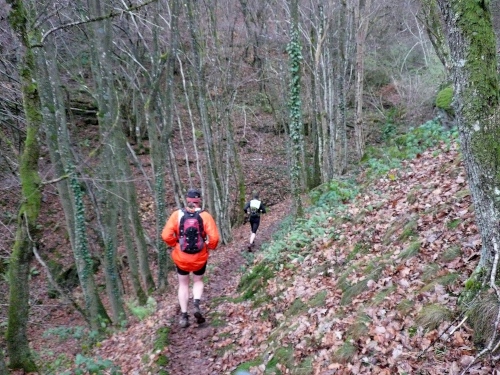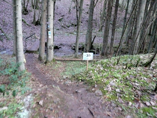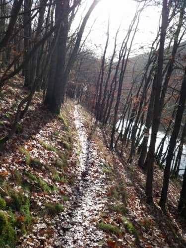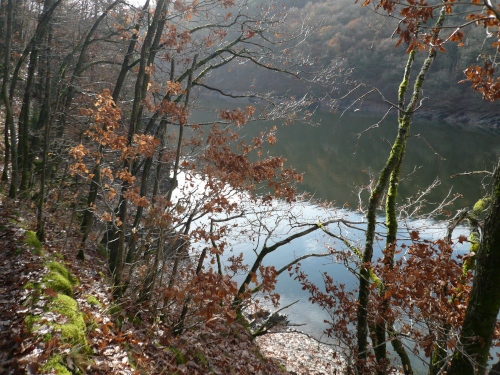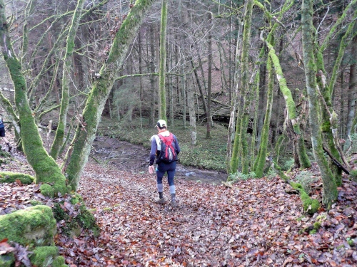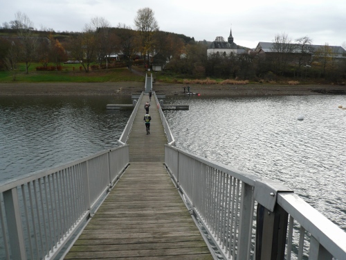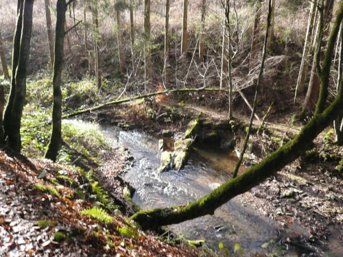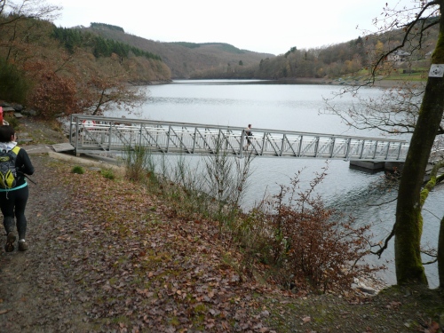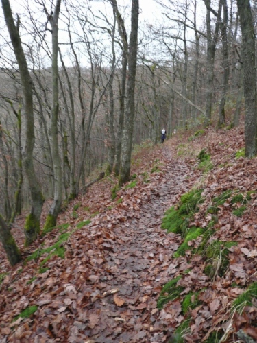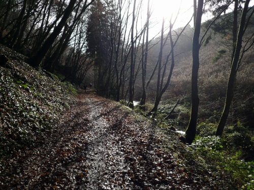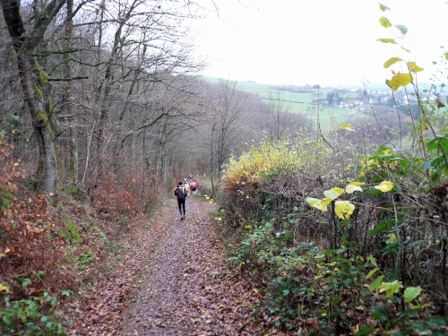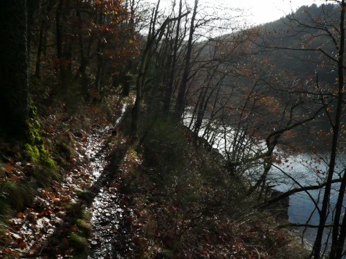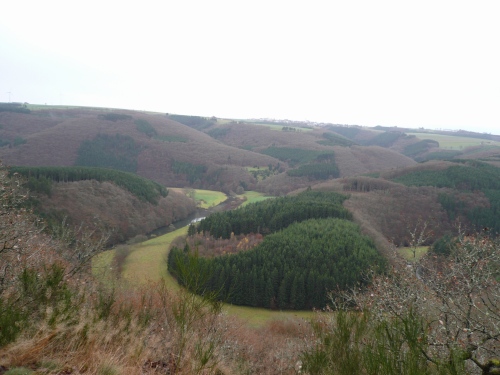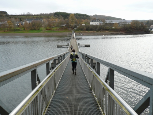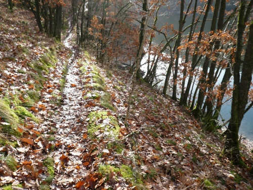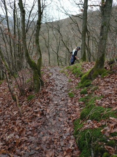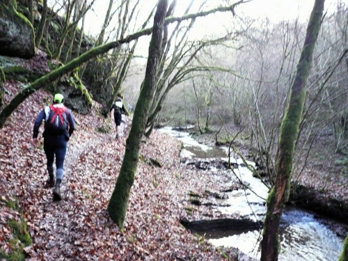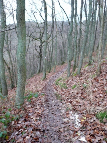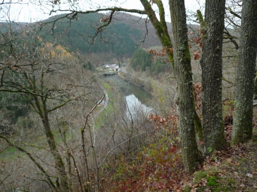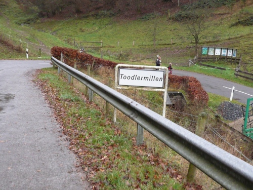 Unheimlich steil geht es jetzt einen kleinen Pfad abwärts nach Toddlermillen. Hier treffen wir auf die Sauer. Die Mühle ist schon lange nicht mehr vorhanden, nur der kleine kräftige Toddlerbach und ein Campingplatz. Wenige Meter auf der Strasse, dann dürfen wir uns hochkämpfen. Der Pfad wird immer schmaler, die Aussicht immer besser. Kilometerlang zieht sich der Trail am Steilufer entlang, hier ist volle Konzentration gefordert.
