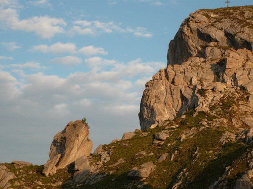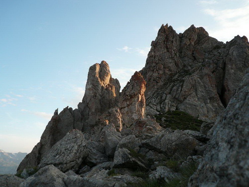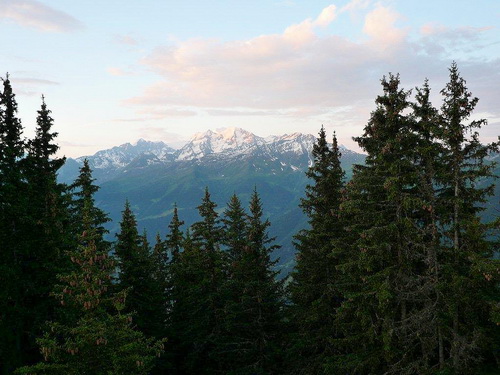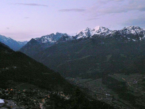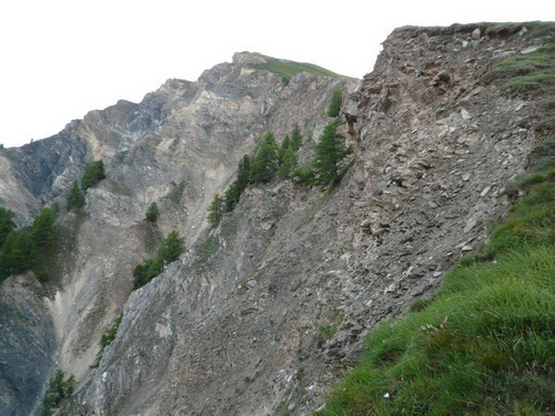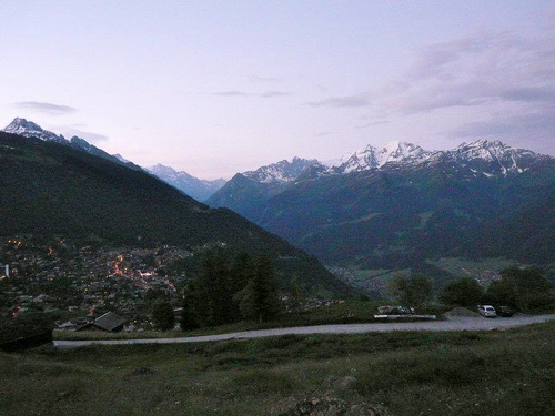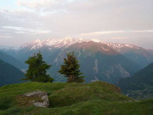 Im Zickzack schrauben wir uns hoch, dem Morgenlicht entgegen, während noch die Lichter Verbiers zu uns hochleuchten. Über Wiesen und Weiden, einer Suone (französisch: un bisse)entlang und durch einen schönen Nadelwald geht es über die Baumgrenze hinaus. Die bunte Läuferschlange windet sich den Berg empor und stört die morgendliche Ruhe eines Rudels Gämsen. Weil wir ihnen den Weg zu ihrem Rückzugsgebiet in der Geröllhalde versperren – ein Blick dort hinunter und mir kribbelt es in den Fingern und im Bauch – suchen sie sich andere Wege. Ich bin fasziniert von der Geschwindigkeit und der Trittsicherheit mit der sie sich vor uns Eindringlingen wegbewegen und erstaunt, wie ihre Hufen im Galopp den Boden zum Zittern bringen.