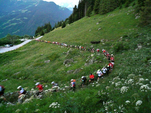 Dann geht es hinaus in die letzten dunklen Minuten dieses Morgens. Außer im vorderen Bereich hetzt niemand los, denn nach einer kurzen Schlaufe im Dorf beginnt gleich der erste Anstieg. In der anbrechenden Dämmerung kommen wir auf den Geschmack und auf Touren für die bevorstehenden Kilometer und Höhenmeter. Auf der „Boucle“ sind das immerhin 110km und 6900Hm.