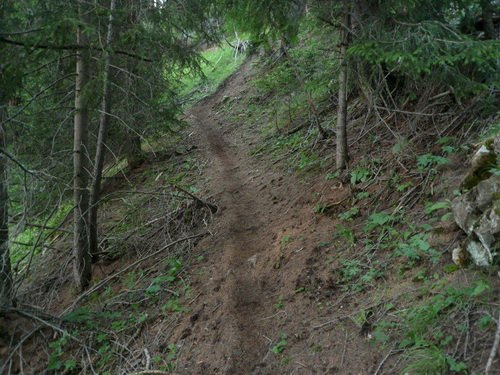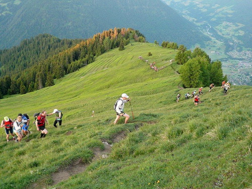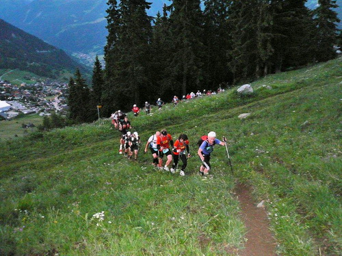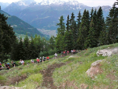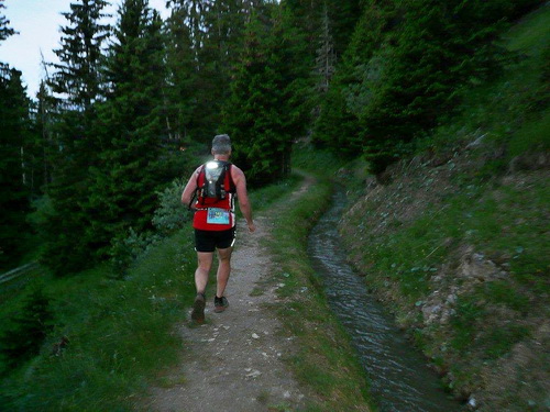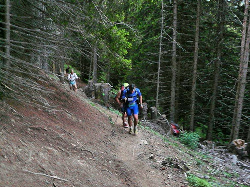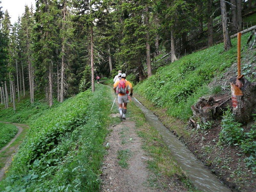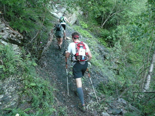 400 Höhenmeter werden bis zum nächsten Fixpunkt auf der Karte abgebaut. Das Profil der Strecke ist nicht nur im ausführlichen, vor der Veranstaltung zugestellten Roadbook enthalten, sondern auch auf der Startnummer aufgedruckt. Kleines Detail: Damit man es im Lauf lesen kann, steht es auf dem Kopf. Zu viel sollte man den Blick auf der dem Rhonetal zugehörenden Bergflanke nicht vom Single Trail nehmen, der längere Zeit an einer zerfallenen Suone entlang führt. Stellenweise ist das Gefälle so stark, dass bereits der erste Bodenkontakt der oberen Extremitäten mit dem feuchten Waldboden stattfindet.