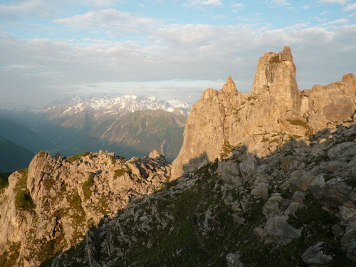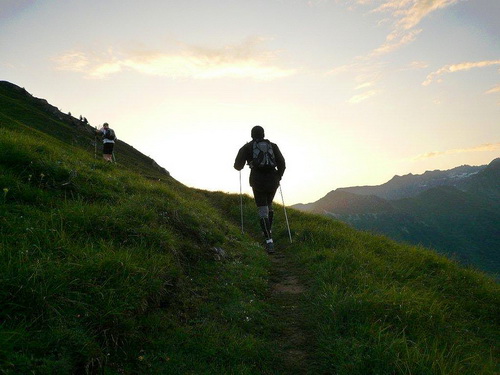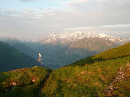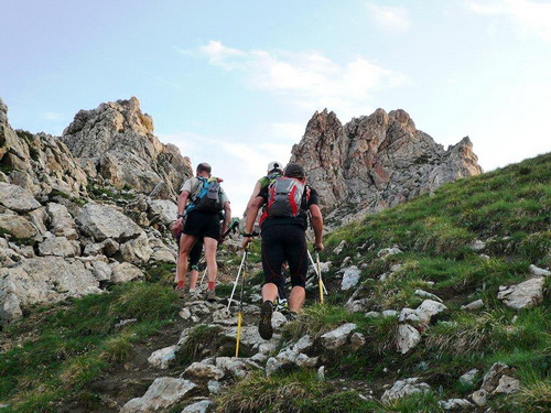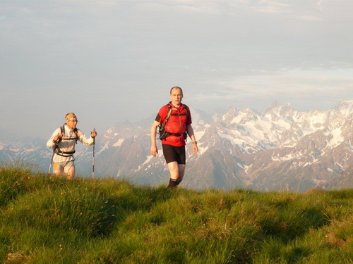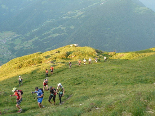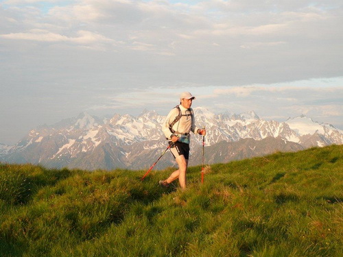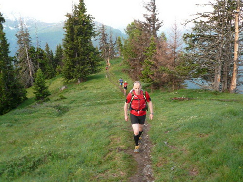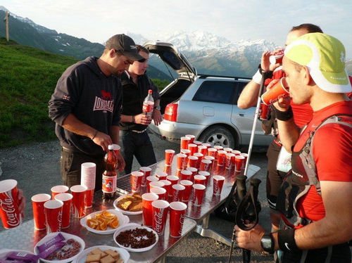 Der erste Kulminationspunkt unterhalb des Pierre Avoi ist erreicht. Von hier aus gibt es einen grandiosen Rundblick. Die Morgensonne taucht die verschneiten Berge in ein warmes Licht, während die Täler noch schattig in der Tiefe liegen. Der aufgehenden Sonne entgegen geht es lockeren Schrittes zum Croix de Coeur, wo nach den ersten 1000Höhenmetern und dem Zehnfachen an Laufstrecke der erste Verpflegungsposten eingerichtet ist. Beim Eintritt in die Verpflegungszone wird wiederum der Chip eingelesen.