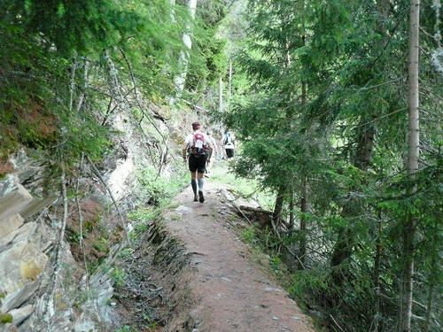 Es ist 9.00 Uhr, 27km liegen hinter mir - aber erst 1237 Höhenmeter. Dies wird sich bald ändern. Sembrancher wird auf den engen Straßen des alten Dorfkerns verlassen und dann geht’s gleich wieder los. Zuerst noch auf der Schattenseite des Hügels steigt der Weg zuerst steil an, dann kommt der Wechsel an die Sonnenseite. Sofort kommt meine Temperaturanzeige in den roten Bereich, daran können auch die flachen Zwischenstücke nichts ändern. Mit dieser Schwierigkeit bin ich nicht allein. Der Brunnen im nächsten Dörfchen wird nicht nur von mir ausgiebig genutzt. Danach gibt es noch ein wenig Schonfrist bis es im Wald wieder richtig steil wird.