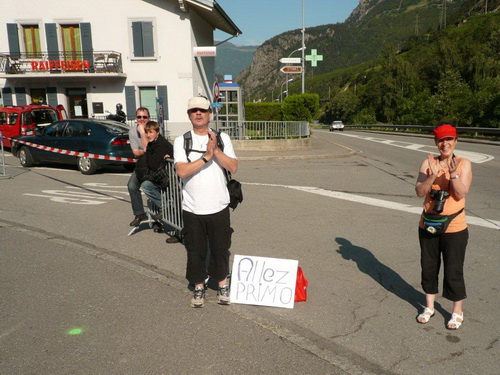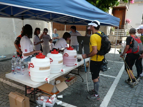 Erholung für die erstmals geplagten Oberschenkelmuskeln gibt es beim gemächlichen Anstieg zum Col du Lin. Jetzt habe ich auch Zeit und Lust auf den noch ausstehenden Teil meines Frühstücks. Während ich zügig vorwärtsschreite, knabbere ich an einem Laugenbrezel. Ich spüle den letzten Bissen herunter und lasse es nach Levron hinunter rollen. Beim Dorfbrunnen erwarten uns freundliche Helfer mit flüssiger Verpflegung und wieder das Lesegerät für den Chip, von welchem die Daten ans Live Tracking geschickt werden. Mittlerweile wird zuhause ein Teil der Familie sich das erste Mal im Internet erkunden, wohin ich es schon geschafft habe.