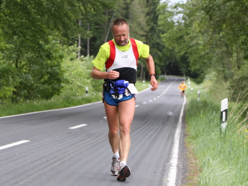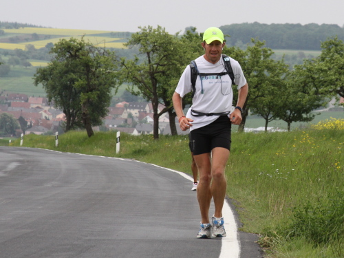 Rainer Koch gewinnt heute seine 20. Etappe. Mit fast 1600 Kilometern in den Beinen läuft er die 65 km in 5:26, wieder ein 5er Schnitt, wie am ersten Tag. Der Mann ist ein Phänomen. Man glaubt es ihm, er läuft aus Spaß. Eine Anstrengung ist kaum erkennbar. Er orientiert sich ausschließlich am eigenen Vermögen, lässt sich kein Tempo und keine Strategie aufzwingen. Sein erstes großes Ziel, Dettelbach, hat er erreicht. Das nächste Zwischenziel heißt Kiel. Weiter will er nicht denken. Auch nicht an einen Sieg. Fast vier Stunden ist sein Vorsprung auf den Zweiten, René Strosny, sechs auf den Japaner Senoo und fünfzehn auf Robert Wimmer, den „Titelverteidiger“. „Nicht viel“, meint Rainer. „Eine Verletzung, ein paar schlechte Tage, und schon ist alles anders. Das Rennen wird auf dem letzten Drittel entschieden." Und dann will er noch dabei sein. Das ist alles.