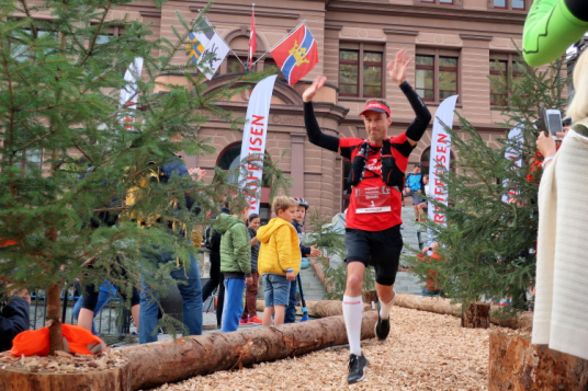 Ein Highlight und ein Unikum zugleich ist das Startprozedere selbst. Aufgrund der Tatsache, dass es schon bald nach dem Start auf schmalen Pfaden weitergeht, ist der übliche Massenstart ab 9:15 Uhr durch Intervall-Einzelstarts ersetzt. Konkret heißt das: Die Läufer starten einzeln in Abständen von 5 Sekunden, wobei die bei der Anmeldung angegebene 10 km-Zeit für die Reihenfolge maßgebend ist. So richtig speziell wird das Ganze durch eine weitere Eigenheit: Denn gestartet wird von einer mehrere Meter hohen Rampe, die aus Felsquadern aus Valser Granit vor dem fahnengeschmückten Hauptportal des Rathauses aufgeschichtet wurde. Von der Spitze dieser Rampe muss dann jeder Läufer nach persönlichem Aufruf über Stufen herunter steigen und zunächst einen mit Sägespänen unterlegten Parcours bezwingen. Wie Slalomstangen sind auf dem Parcours zusätzlich kleine Nadelbäume platziert. Hört sich originell an … und ist vor allem ein Heidenspaß, für Läufer wie für Zuschauer.