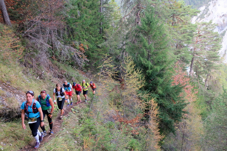 Die schönsten Passagen des Trails stehen bevor. Auf einem ausgesetzten, meist offenen Trampelpfad geht es nun in stetigem Auf und Ab durch den Steilhang. Durchaus herausfordernd ist dieser Pfad, doch die fantastische Landschaft scheint den Läufern Flügel oder besser gesamt Gämsenbeine zu verleihen. Unter uns zieht das hellblaue Band des Flusses, begleitet von den Bahngleisen, dahin, neben und vor uns türmen sich dramatisch die vom Bergwald umrahmten Steilhänge der Schlucht. Immer näher rücken die Wände zu beiden Seiten des Flusses zusammen.