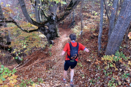 Je höher wir kommen, desto dichter wird der Wald und weniger Ablenkung ist geboten. Tief in sich versunken und schweigend zieht die Schneckenkarawane der Läufer dahin. Kurzzeitige Erholung verspricht eine flache Passage durch raschelndes Laub am Hang entlang, nur um danach, steiler denn je, erneut in die Höhe zu streben.