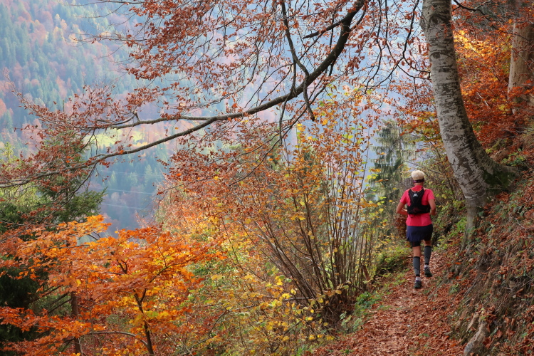 Das Gegenteil davon: Anstieg zwei. Ein schmaler, matschiger, steil durch Dickicht führender Pfad prägt dieses Etappenstück. Nochmals ordentlich ins Schnaufen komme ich dabei. Der dritte Anstieg ist im Wesen noch mehr trailbehaftet, verteilt den Anstieg aber auf drei kleine Stufen. Ein wenig nach Erlösung fühlt es sich schon an, als ich den letzten „Gipfel“ erreiche und weiß: Jetzt geht es nur noch hinab. Herbstlich nochmals besonders schön eingefärbt ist die lange Gerade, die nach Thusis hinab führt. Ein paar hundert Meter müssen wir dort noch auf Asphalt hinter uns bringen, dann führt ein Abzweig ohne weitere Umschweife hinein ins Ziel.