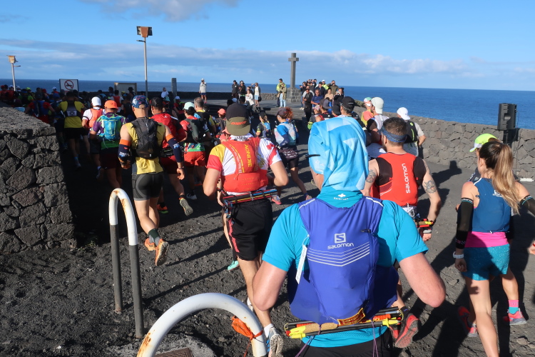Etwa eine Stunde später erreiche ich den Faro. Im Gegensatz zu den Frühstartern dürfen wir die beeindruckende Rundumkulisse bereits im Morgenlicht erleben. Und so auch einen optischen Vorgeschmack auf die inseleinwärts jäh ansteigende Mondlandschaft bekommen. Ganz bis zum Faro fährt der Bus nicht, sondern stoppt etwas höher gelegen an der Straße, sodass wir die letzten Meter auf einem sandigen, aussichtsreichen Trail hinab zu Fuß zurücklegen müssen. Morgendlich frisch ist es, aber heiße Rockmusik schallt uns vom Startgelände, bei den Bootsschuppen unterhalb der Faros und direkt am Meer gelegen, entgegen. Kurz wird das reichlich vorgeschriebene Pflichtgepäck gecheckt, dann geht es hinein in den Läufer Corral. Immer voller wird es, knapp 500 sind es letztlich, die erwartungsfroh dem Start entgegenfiebern. 40 davon wird das Los eines DNF ereilen, aber das ahnt im Moment wohl noch keiner.