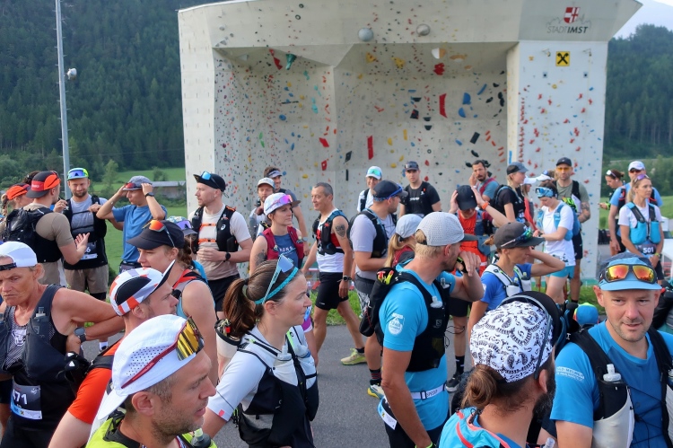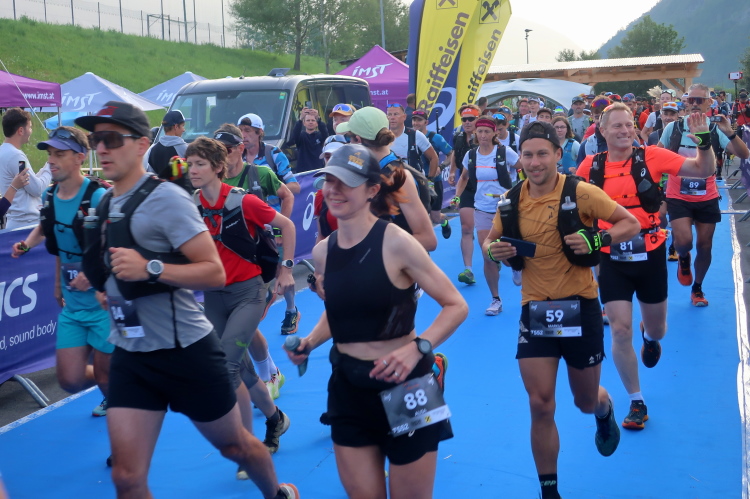 Kaum sind die Marathonis unterwegs, öffnet der Startkorridor zur Pflichtgepäckkontrolle für die TS26-Läufer. Viel gibt es nicht zu kontrollieren, denn ein lupenreiner Sommersonnentag ist vorhergesagt und so ist jegliches „lang-lang“-Equipment entbehrlich. Signifikant höher als bei den beiden Langdistanzen ist der Andrang am Start. Wobei „Andrang“ etwas übertrieben ist. Mit 140 anwesenden Startern hält sich auch der TS26 noch im familiären Rahmen. Wobei insgesamt 500 Läufer aus 25 Ländern, so der Startmoderator, durchaus unterstreichen, dass sich die Veranstaltung überregional herumgesprochen hat.
