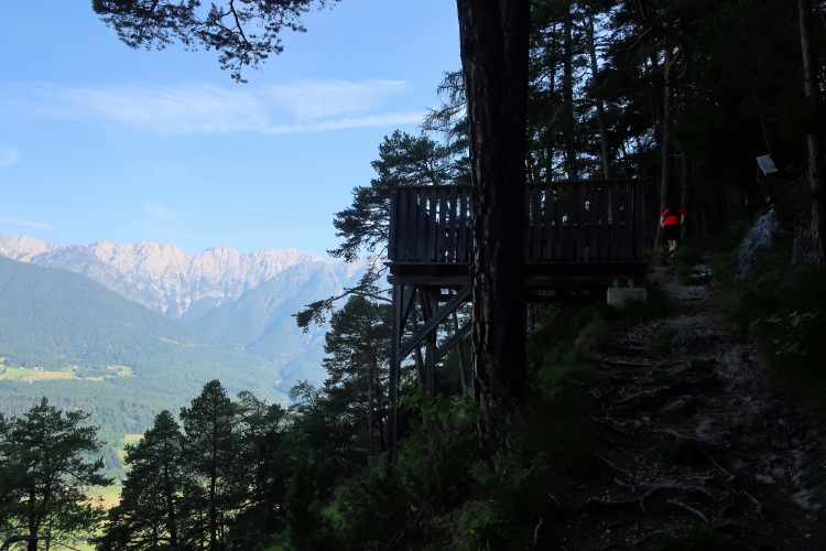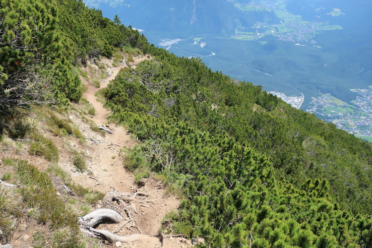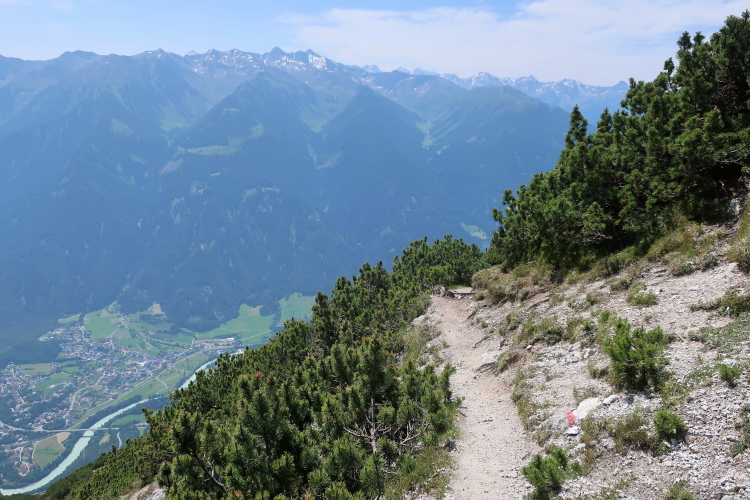 Immer wieder grandios ist der Blick in die Tiefe, in der ich aus der Vogelperspektive weithin beobachten kann, wie sich der Inn durch sein Tal mäandert. Überaus schweißtreibend und die Beinmuskeln fordernd ist dieser noch dazu voll der Sonne ausgesetzte Downhill Trail. Auch mein Flüssigkeitsvorrat geht zur Neige. Ich sehne den nächsten Verpflegungsposten herbei. Aber da muss ich mich gedulden. Tief unten, dort, wo das steile Latschengelände in Almwiesen mündet, sehe ich eine kleine Hütte stehen und mutmaße, dass dort wohl die erste Gelegenheit sein wird, so etwas einzurichten.