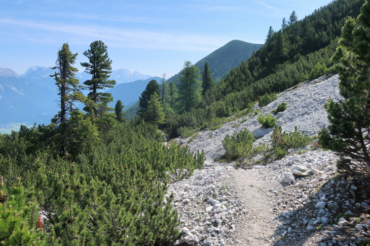 Über die Alm hinweg führt ein wurzeldurchsetzter Pfad nun zunehmend steil in die Höhe. Der hohe, dichte Baumstand lockert zusehends auf und wird abgelöst durch üppige Bestände deutlich niedrigerer Latschenkiefern. Hübsch anzuschauen sind sie. Gleichzeitig wird der Untergrund steiniger, gerölliger, profilierter.