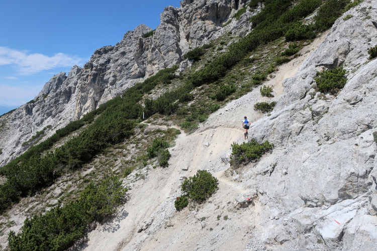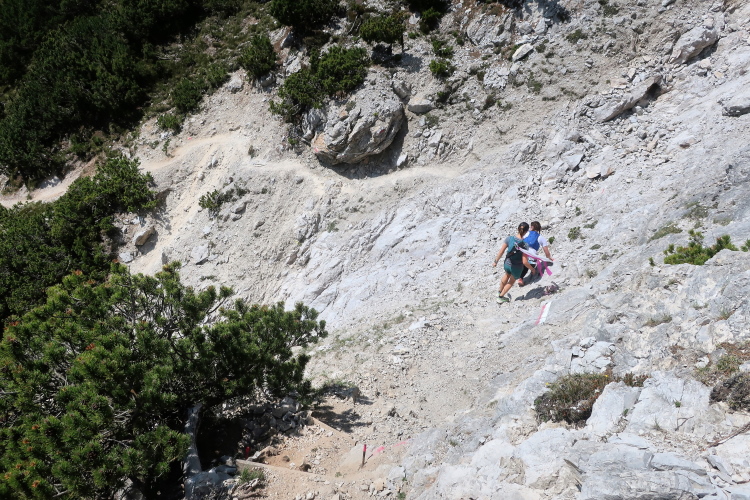 War für den Aufstieg die Nordseite des Tschirgant bestimmend, so ist es für den Abstieg nunmehr die Südseite. Und der hat es in sich. In der Streckenbeschreibung im Internet fasst es der Veranstalter so zusammen: „Ebenso der Technische Downhill lässt Trailrunning Herzen höherschlagen“. Das kann man durchaus so sehen. Aber der Trail ist hier bisweilen so abschüssig und ausgesetzt, dass zumindest mein Herz auch aus anderen Gründen höherschlägt.