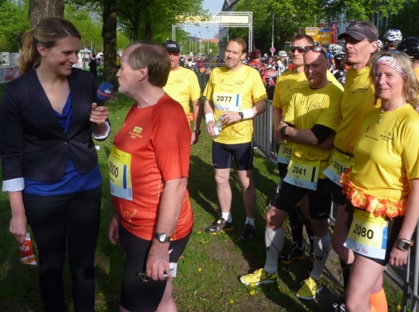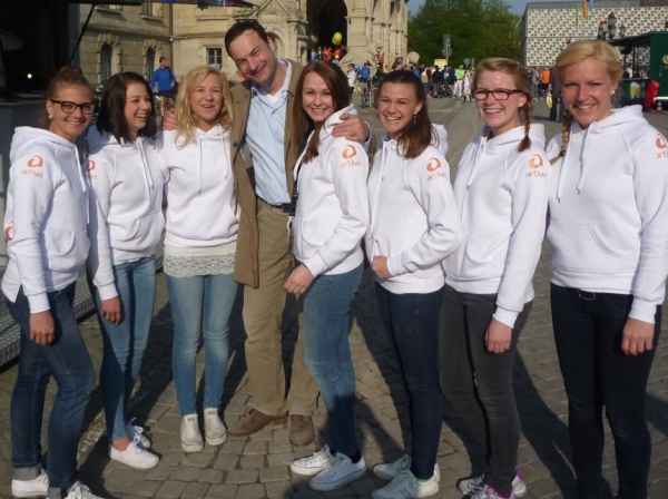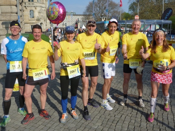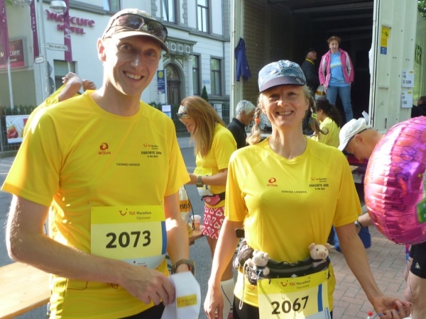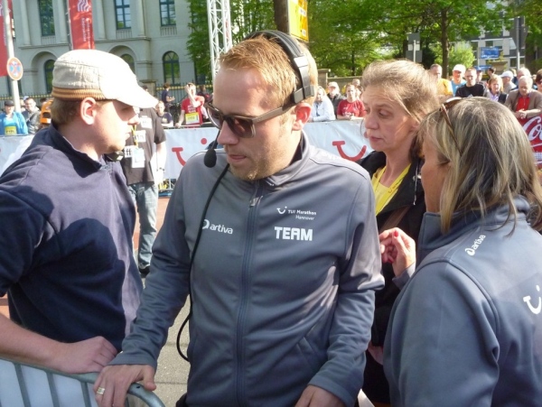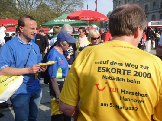 Im Marathonmessezelt ist Trubel rund um den Ausstatter „artiva“, einer Firma, die seit einem Monat im Handelsregister eingetragen ist und nun für Furore mit der Gestaltung persönlicher Finisher-Shirts macht. Der Chef von artiva, schon früher im Bereich Sportevents tätig, verwirklicht nun seine Idee, hochwertige Funktionskleidung zu personifizieren. Dafür steht jedem Läufer ein persönlicher Designer zur Verfügung. Kein Wunder, dass sich die Läufermassen um den Messestand drängen. Nebenher werden noch 300 Shirts verteilt. Wer in diesen Shirts finisht, kann eine Reise zum TUI Marathon auf Mallorca gewinnen.