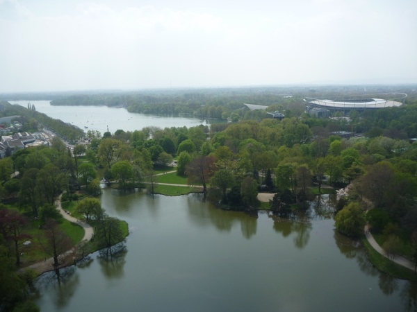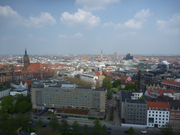 Der verglaste Aufzug ist einzigartig in Europa und bietet mit seinem wechselnden Schwerpunkt eine kleines Abenteuer, ehe man die letzten Stufen hinauf schwankt. Von oben herrlicher Rundblick nach Norden über die Stadt und das Startgelände, nach Westen zu den drei Türmen des Kraftwerkes (die drei warmen Brüder), nach Süden über den Maschsee mit der AWD Arena und der Laufstrecke. Ja, sogar das Wohnmobil von Conny und Jörg auf der Schützenwiese ist erkennbar. Nach Westen über das neue Haus der NordLB bis zu den Kalihalden am Horizont - was für eine grandiose Marathonmall!