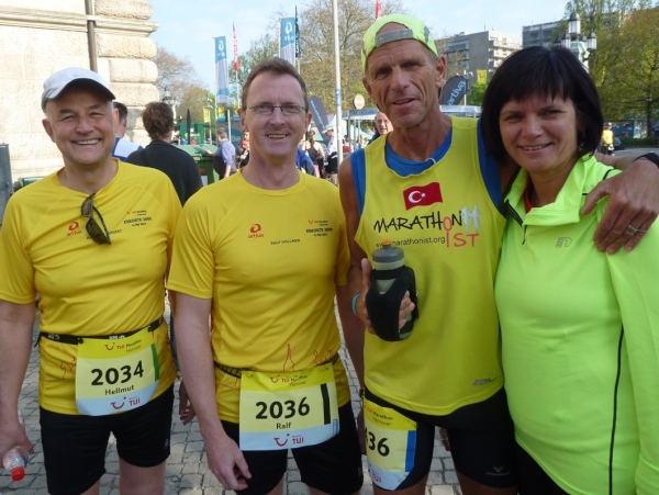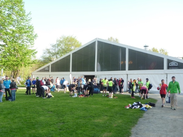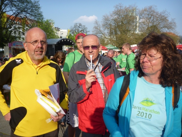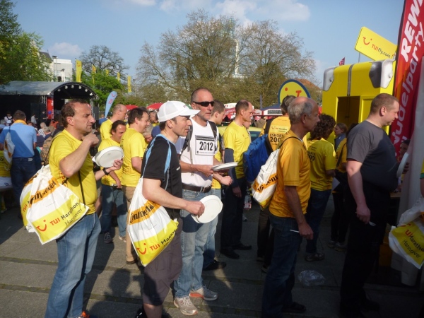 Es ist schon grausam, von einem Moderator geweckt zu werden. Din simples „Eins, Zwo, Drei !“ hätte es auch getan. Zum Glück ist dies ein Marathon der kurzen Wege. Nur Dieter Baumann wieselt auf allen Wegen. Dabei kann man sich die Zähne doch im nahen Duschzelt putzen. Wer sich noch nachmelden möchte, der kann dies im Neuen Rathaus machen. Wer schon vorangemeldet ist, der erhält seine Startnummer im Zelt der Marathonmesse. Kleiderbeutelabgabe ist bei den Lastwagen an der östlichen Seite.