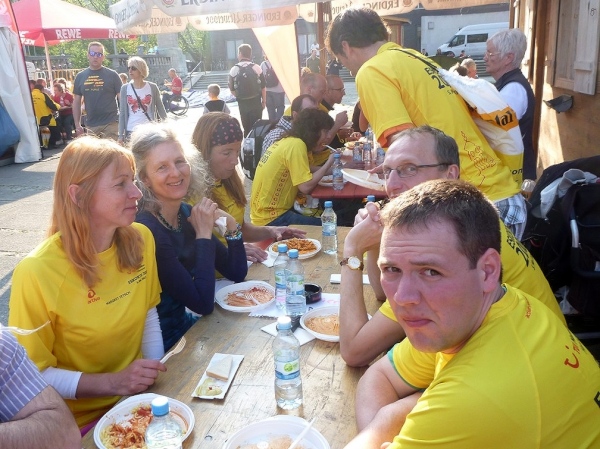 Ich sitze mit der (Altersklassen-)Weltmeisterin im 100 km-Lauf, Anke Meinberg, beim Bierchen! Wir kennen uns, seitdem Wilhelm meine fliegende Nikolausmütze in Arolsen vor die Linse bekam.