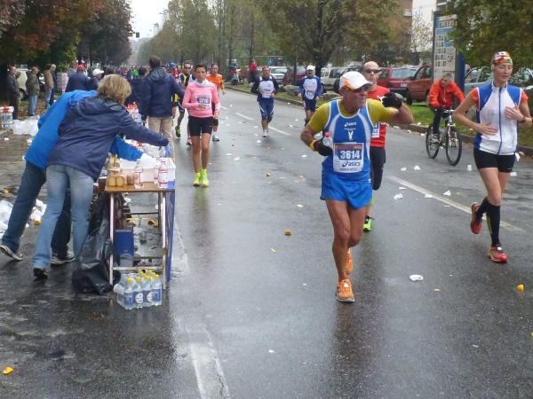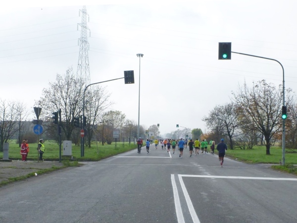 Wegen der Stimmung ernenne ich hiermit den Turin-Marathon ehrenhalber zum Nichelino-Marathon. Wenn ich mich an unsere erste Teilnahme 2010 richtig erinnere, waren die Gemeinden außerhalb schon damals wahre Stimmungsnester. Zur Beruhigung geht es jetzt erst einmal in eine Hochhaussiedlung. Jedoch befinden sich auch dort viele Zuschauer am Straßenrand. Das kommt dem Bedürfnis, das mich seit einiger Zeit quält, nicht entgegen. Erst bei Kilometer 15 verlassen wir die Bebauung und laufen in die Felder. Die Verpflegungsstellen sind übriges exakt alle 5 Kilometer aufgebaut. Es gibt Wasser sowie ein Getränk, das zwar als „Sali“ - also auf deutsch Iso - bezeichnet wird, aber eigentlich nur Sprudel mit Magnesium ist. Jeweils in Halbliterflasche oder im Becher, dazu Bananenstücke (in Schale), Orangenstücke, Zwieback und Kekse.