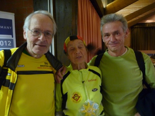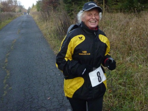 Dann überholt mich die hübsche Besenfahrradfahrerin: „Hallo Nikolausi!“, sie will unbedingt nächstes Jahr den Marathon mitlaufen. Sie hat jetzt begriffen, wie schön die Strecke ist. Sie überholt mich aber nur, weil jetzt „hinten“ alles geklärt ist und alle durchkommen. „Da ist eine, die ist schon 239 Marathons gelaufen!“ „Ja, das ist Christine, die läuft ja erst seit etwa 4 Jahren, und vorne ist Sigrid, die hat mehr als 1600 Marathons!“