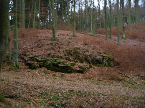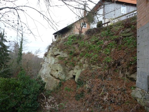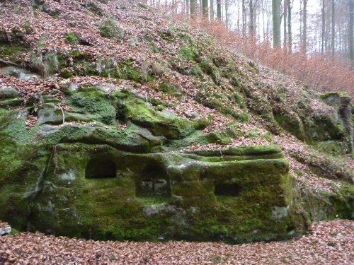 Und dann bei km 35 ist dieser eigenartige Felsen. Ich möchte nicht, dass ihr am 26.05 oder beim nächsten Adventsmarathon achtlos dran vorbei lauft! Die Stelle ist dort, wo es flach wird, links, 2 Meter weiter. Ich habe die Stelle in einem Geocacheforum gefunden. Dort lebte mal ein Einsiedlermönch namens Volkhard. Es ist derjenige, der das Kloster Volkhardingshausen (1171) gegründet hatte. Die Nischen für die Heiligenfiguren sind noch sichtbar. Später stand hier eine Kapelle, wie die Inschrift jüngeren Datums im Felsen aussagt. Es soll von hier aus noch einen unterirdischen Gang zum Kloster geben.