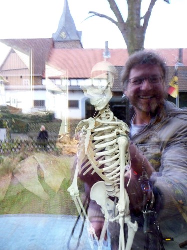 Landau. Ich wollte diese Bergstadt unbedingt besichtigen, nachdem ich nun jahrelang dran vorbeigelaufen bin. Empfehlenswert! Viele Stadttore, schiefe Fachwerkhäuser, ein uralter Friedhof, der Kump ( Brunnen), der immer noch (im Sommer) von der Wasserkunst gespeist wird. Blick über unsere gestrige Laufstrecke. Häuser, die direkt über den Sandsteinfelsen schweben. Unten das Freibad und die Wasserkunst. Hat mir sehr gefallen, obwohl der Ratskeller nicht geöffnet war. Dafür ein Skelett im Fenster. Mein wildes Gesicht spiegelt sich passenderweise.